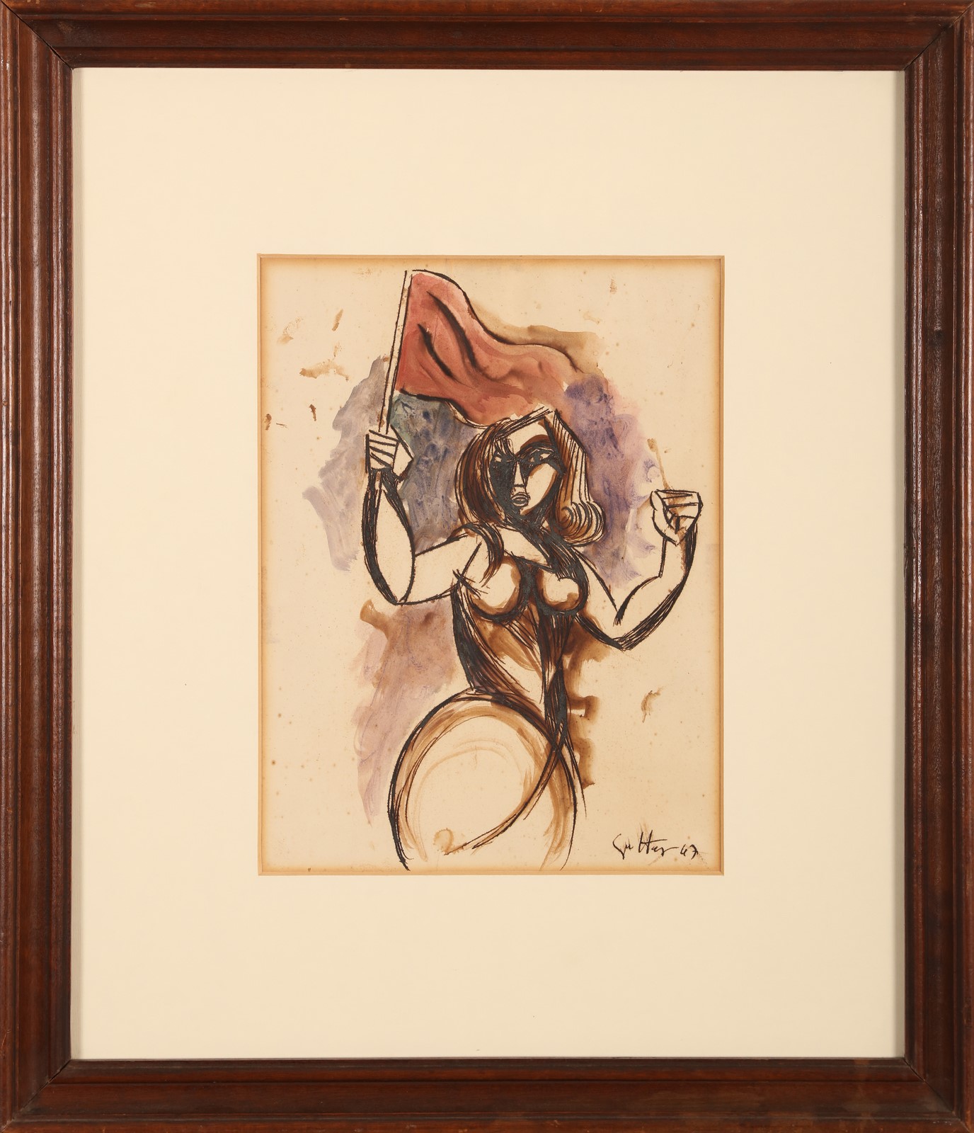 GUTTUSO RENATO (1912 - 1987) La contestatrice. 1947. Acquarello e china su carta. Cm 23,00 x 31,00. Firma e anno in basso a destra. Autentica dell'artista su fotografia. Opera archiviata presso l'Archivio Guttuso, Roma come da documentazione fotografica allegata all'opera riportante il relativo numero d'inventario. Cornice presente