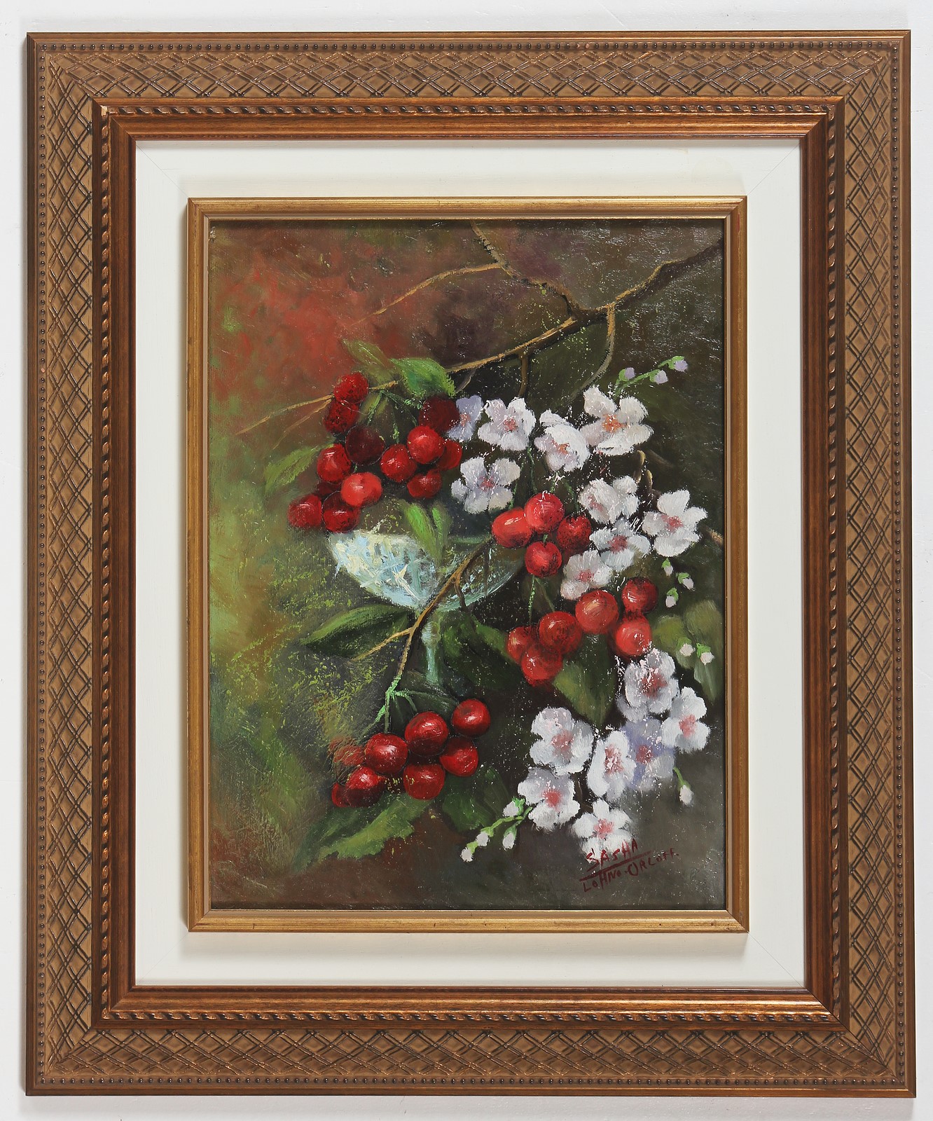 LOHNI ORLOFF SASHA (n. 1947) Frutta e fiori. Olio su tela . Cm 30,00 x 40,00. Firma in basso a destra e al retro. Timbro Galleria d'Arte il Castello, Adria. Cornice presente
