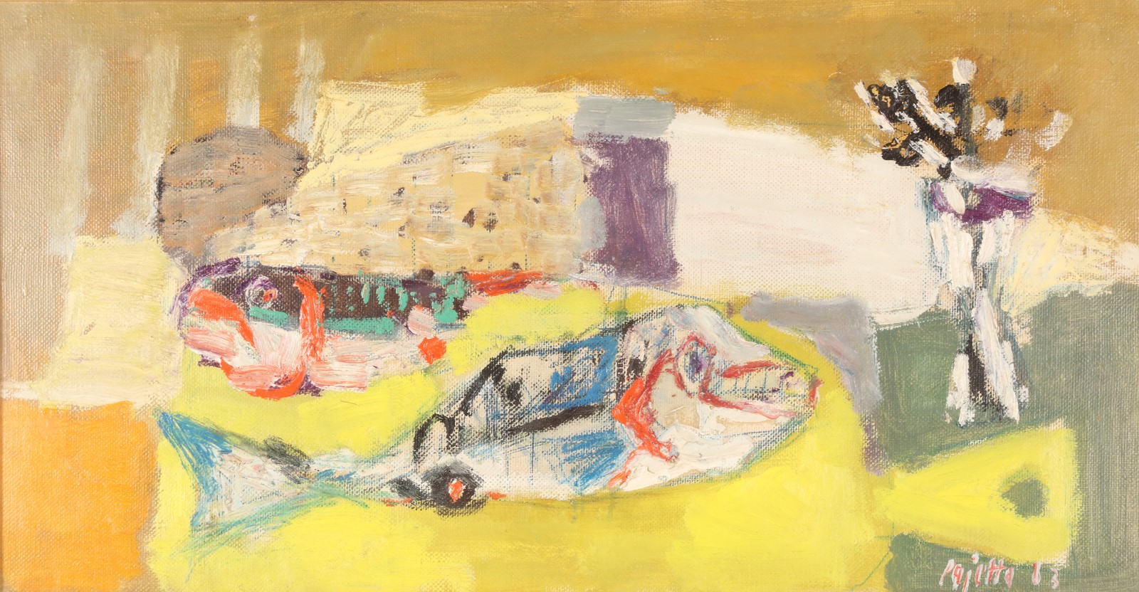 PAJETTA GUIDO PAOLO (1898 - 1987) Natura morta con pesci. 1983. Olio su tela . Cm 70,00 x 35,00. Firma e anno in basso a destra. Cornice presente