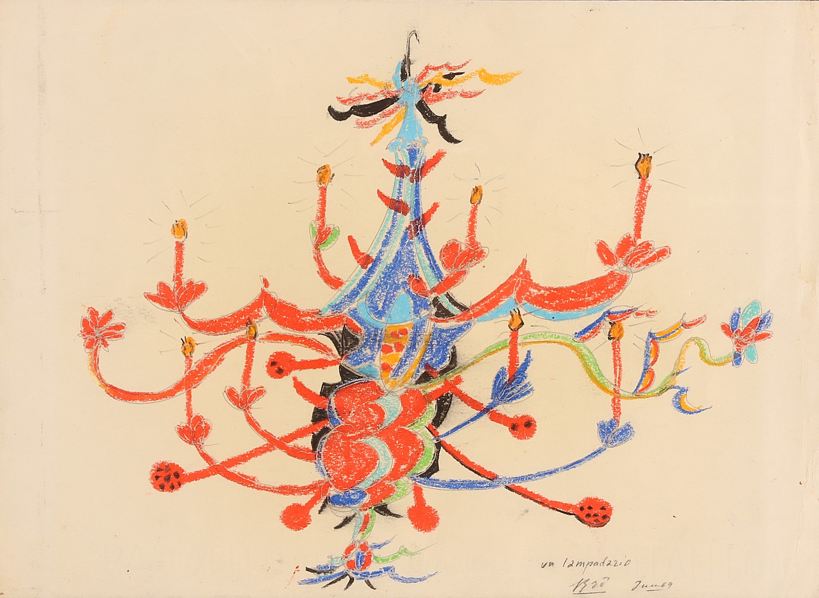 ERRO (n. 1932) Un lampadario. 1958. Tecnica mista su carta. Cm 32,00 x 23,00....