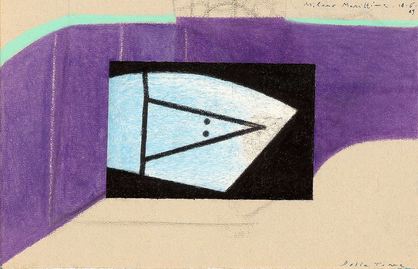 DELLA TORRE ENRICO (n. 1931) Milano Marittima. 1989. Tecnica mista su cartoncino. Cm 29,00 x 19,00. Firma in basso a destra. Titolo e anno in alto a destra. Al retro timbro dell'artista e cartiglio descrittivo Italiana Arte, Busto Arsizio. Autentica dell'artista su fotografia. Cornice presente