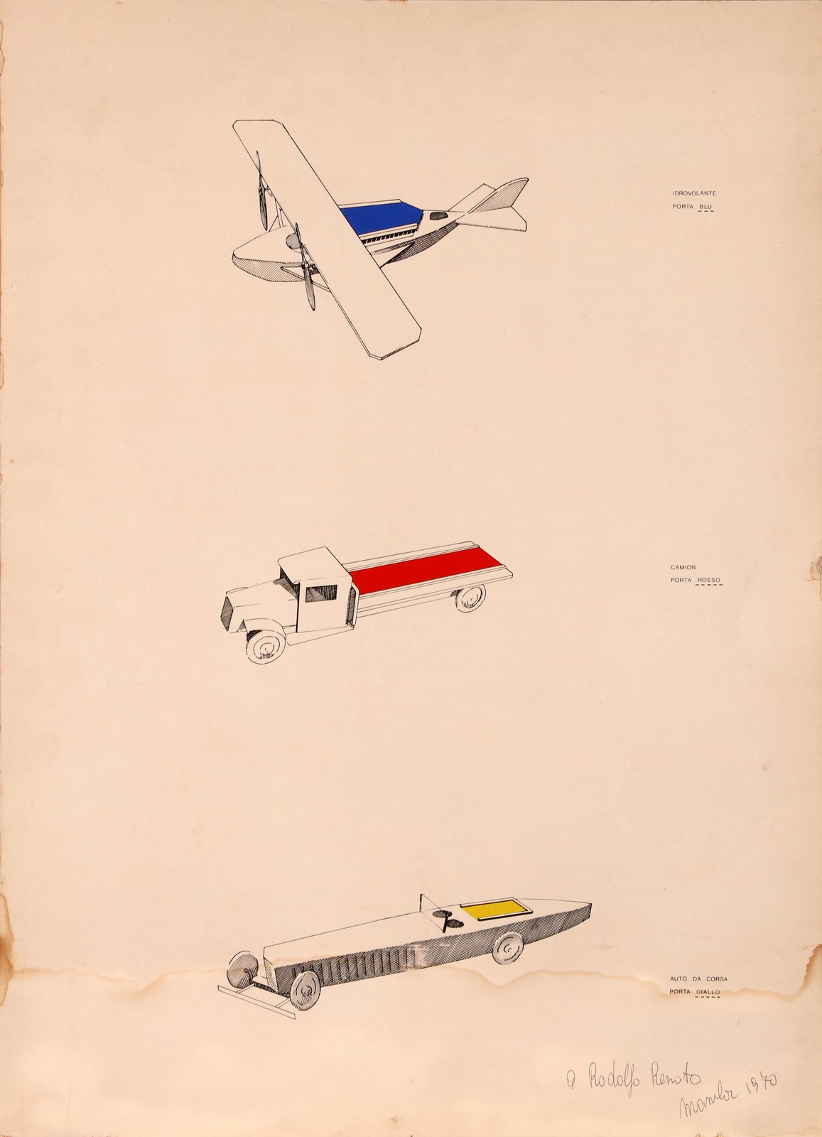 MAMBOR RENATO (n. 1936) Idrovolante porta blu, camion porta rosso, auto da corsa porta giallo. 1970. Tecnica mista su cartoncino. Cm 50,00 x 70,00. Dedica, firma e anno in basso a destra. Autentica su fotografia di Patrizia Speciale. Certificato di autenticità Arte Roma Auctions. Difetti. Cornice presente