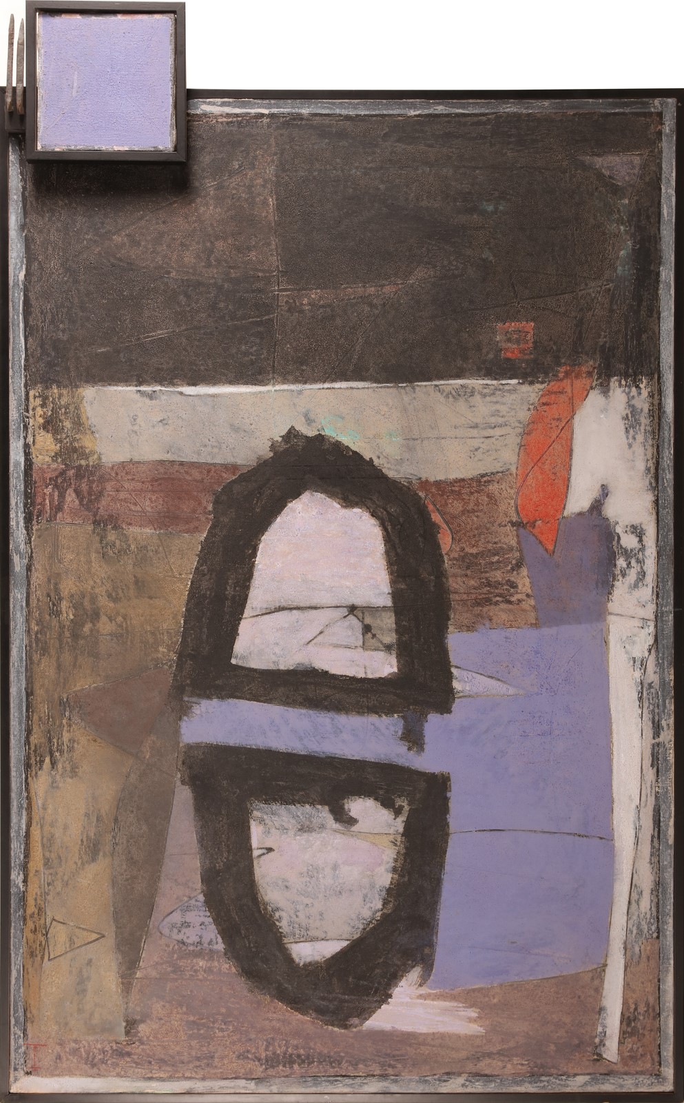 FORMENTI PRIMO (n. 1941) Rapporti. 1989. Tecnica mista su tela. Cm 165,00 x 100,00. Firma in basso a destra. Al retro titolo e firma. Provenienza: Galleria Oprandi. Pubblicazione: Cartello espositivo della mostra Primo Formenti, 3 - 30 Aprile, Centro d'arte S, Apollonia, Venezia.