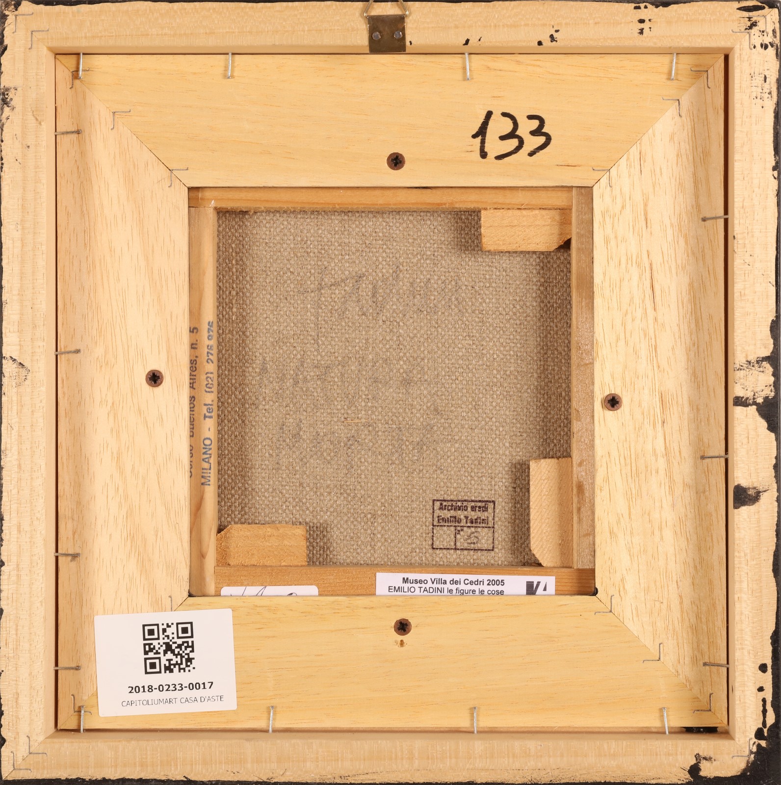 TADINI EMILIO (1927 - 2002) Natura morta. Acrilico su tela. Cm 20,00 x 20,00. Al retro titolo, firma e timbro Archivio Eredi Tadini. Opera archiviata presso l'Archivio Eredi Tadini, come da documentazione fotografica allegata all'opera riportante il relativo numero di inventario. Cornice presente