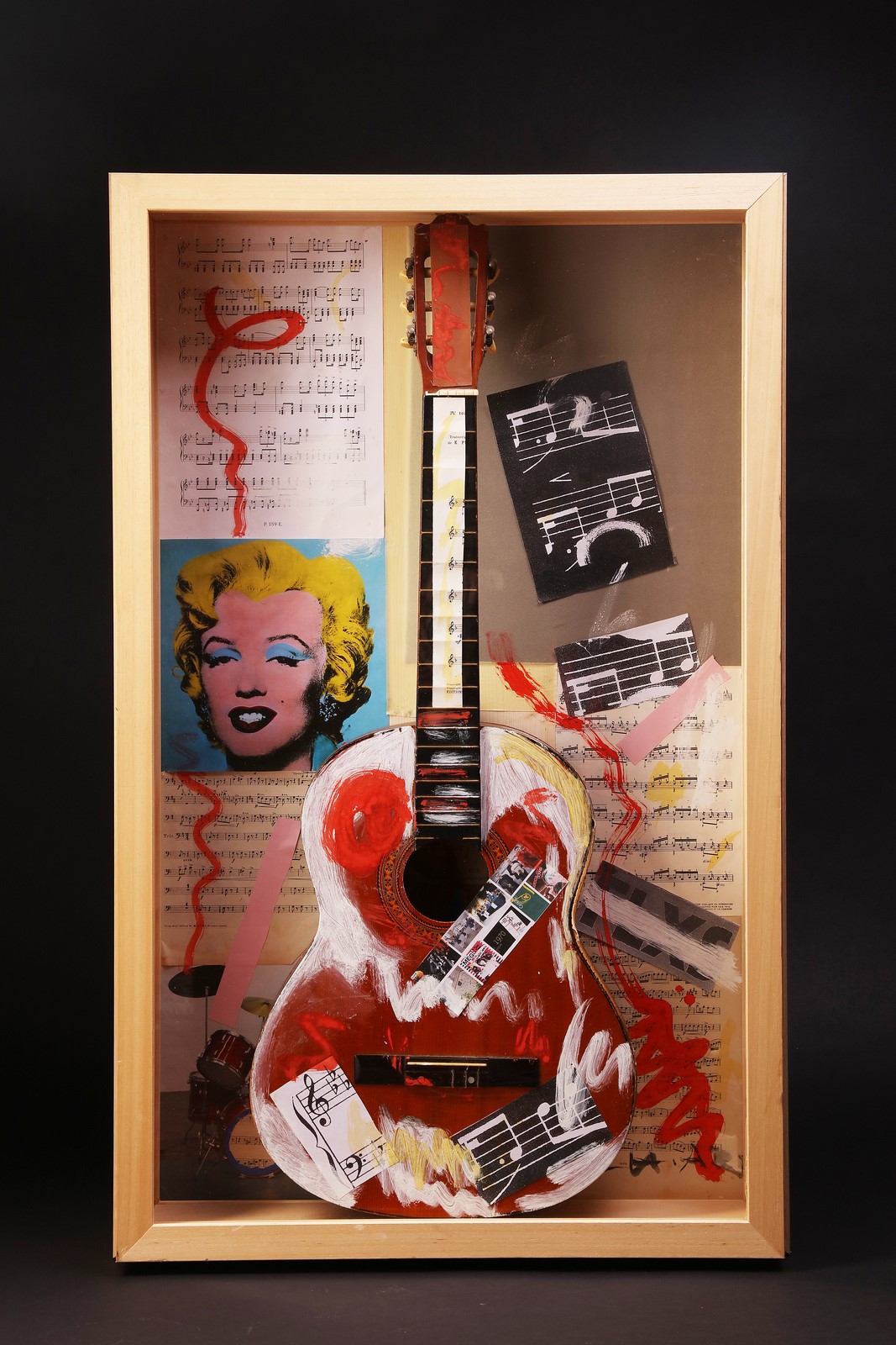 CHIARI GIUSEPPE (1926 - 2007) Chitarra. strumento su tavola. Cm 65,00 x 104,00 x 18,00. Firma in basso a destra. Entro teca di legno. Autentica dell'artista su fotografia. Cornice presente