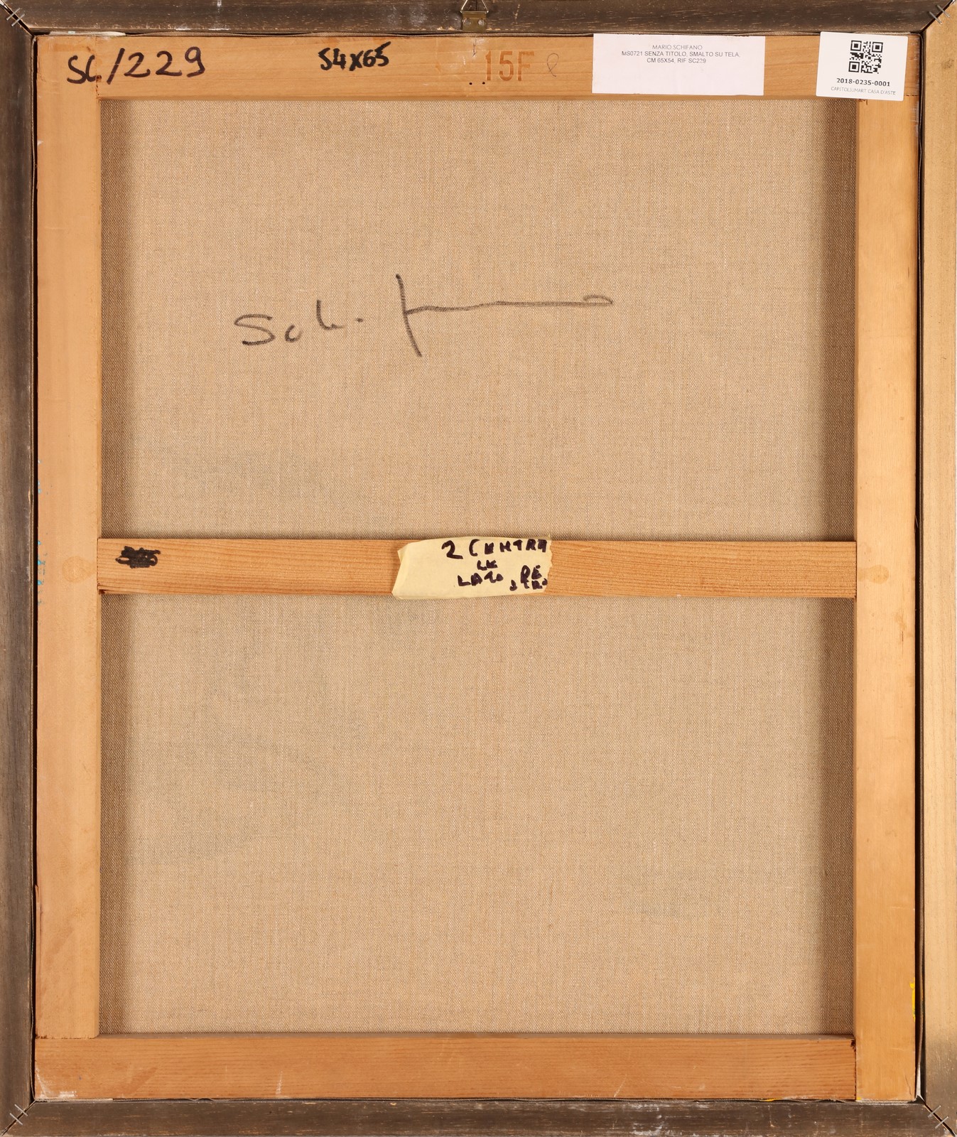 SCHIFANO MARIO (1934 - 1998) Senza titolo. Smalto e acrilico su tela. Cm 54,00 x 65,00. Al retro firma. Autentica dell'artista su fotografia. Opera archiviata presso la Fondazione Multistudio Mario Schifano, Roma in data 20 Novembre 2006 come da documentazione fotografica allegata all'opera riportante il relativo numero d'inventario. 1990-1991. Cornice presente