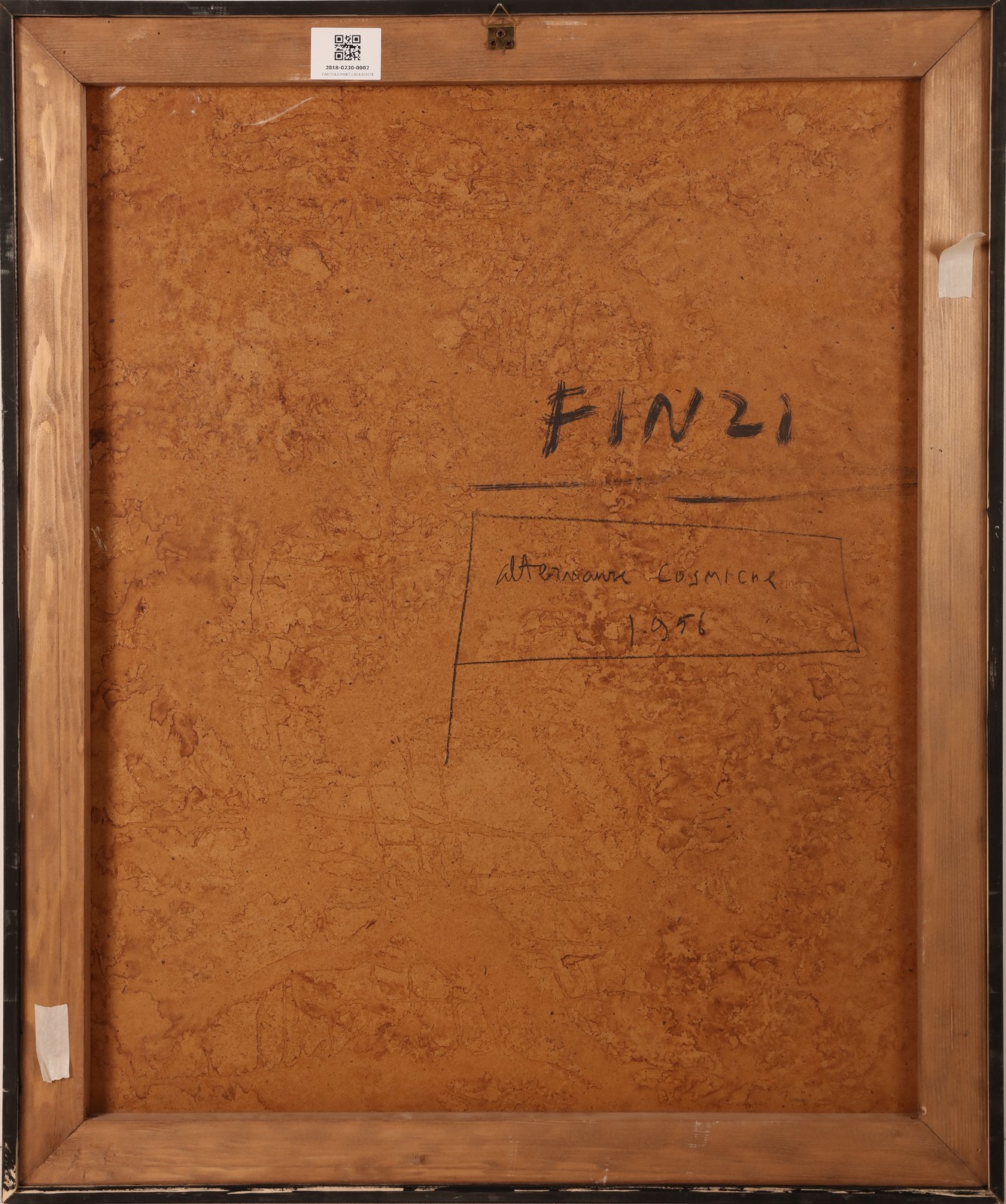FINZI ENNIO (n. 1931) Alternanze cosmiche. 1956. Olio su faesite rovesciata. Cm 73,00 x 89,00. Al retro titolo, firma e anno. Autentica dell'artista su fotografia. Cornice presente
