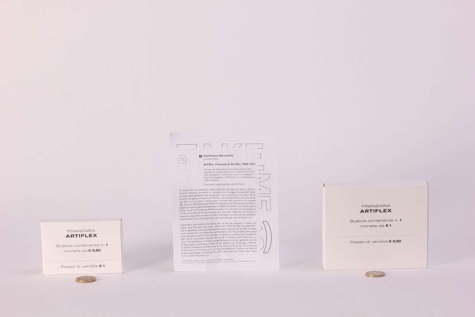 BARUCHELLO GIANFRANCO (n. 1924) Finanziaria Artiflex. . Moneta. . Lotto composto da una moneta da 0.50 euro e moneta da 1 euro in scatola di cartone e colophon originale. Tirato in 500 esemplari. 1968/2017. . Cornice presente