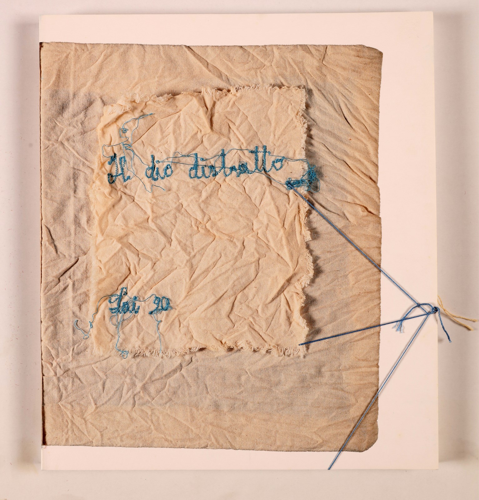 LAI MARIA (1919 - 2013) Il dio distratto. Libro d'arte. Cm 28,00 x 33,00. A.D. arte duchamp, Cagliari 1994. Il libro è un'interpretazione per immagini del racconto che Giuseppe Dessì scrisse per Maria Lai, il libro non è di quelli usuali: non presenta parole ma ricami. Fili sulla copertina e all'interno. Presente colophon e confezione.