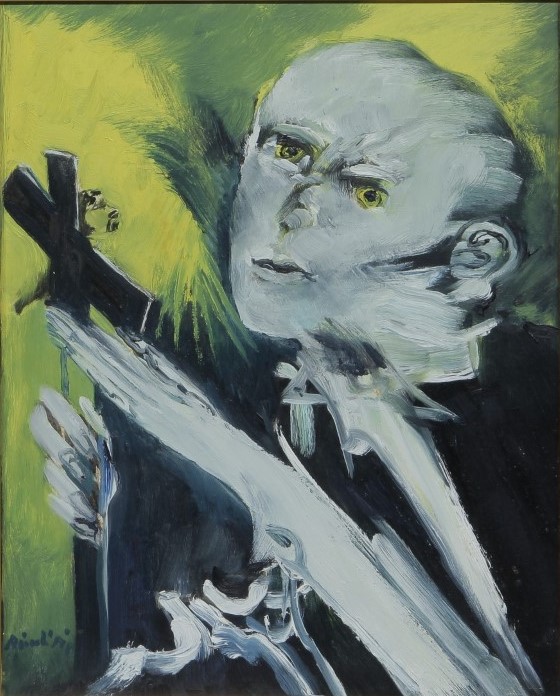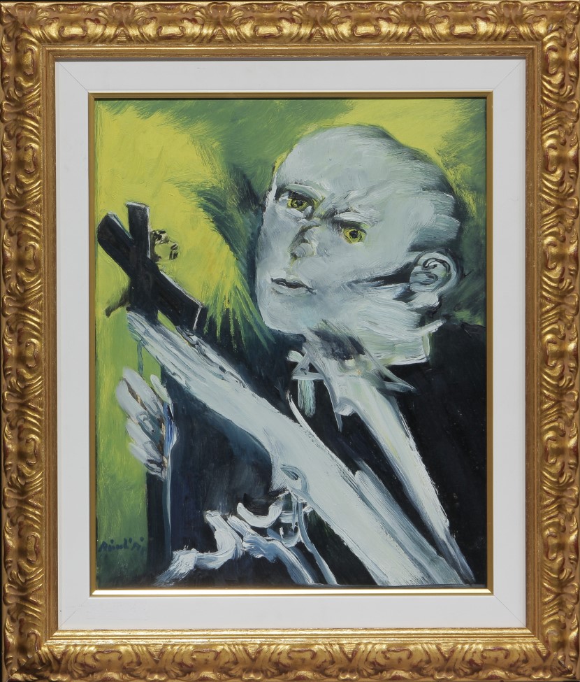 Remo Brindisi (Roma 1918 - Lido di Spina 1996) Sant’Ignazio dello Jola discute Con Cristo 1985 Dim.50x40 Olio su tela Autentica su foto dell’Artista Al verso autentica dell’Artista Firmato in basso a sx
