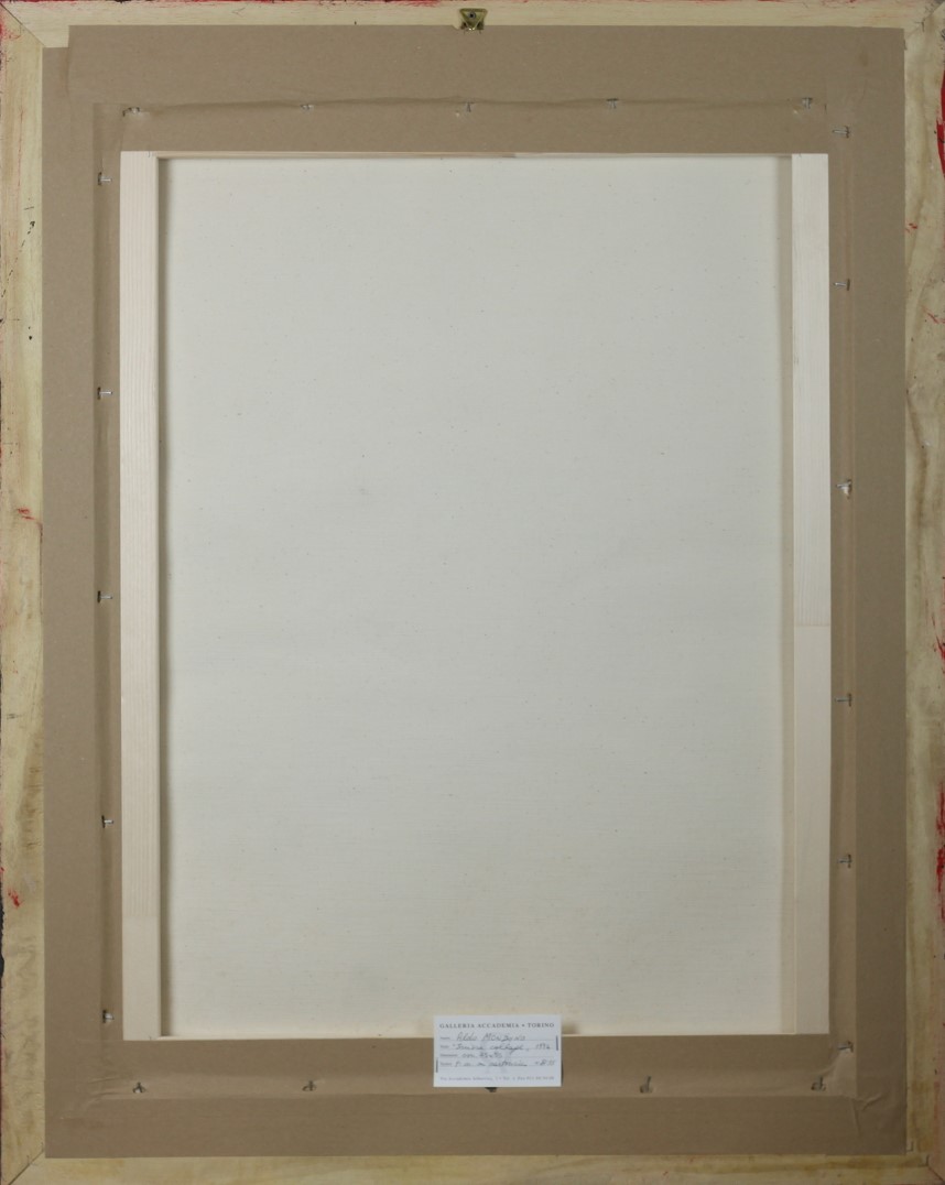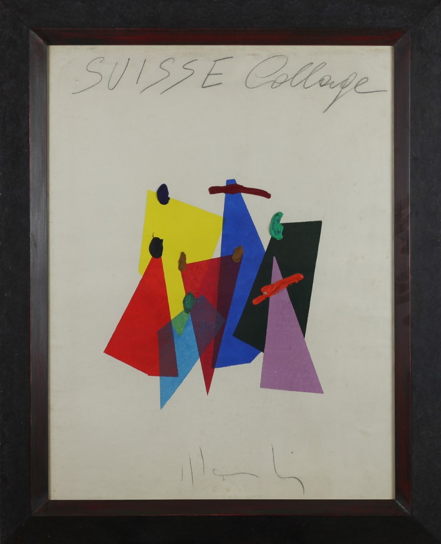 Aldo Mondino (Torino 1938 - Torino 2005) Suisse collage 1974 Dim.75x55 Tecnica mista su cartoncino rimesso su tela Opera in fase di archiviazione Titolo in alto Firmato in basso al centro