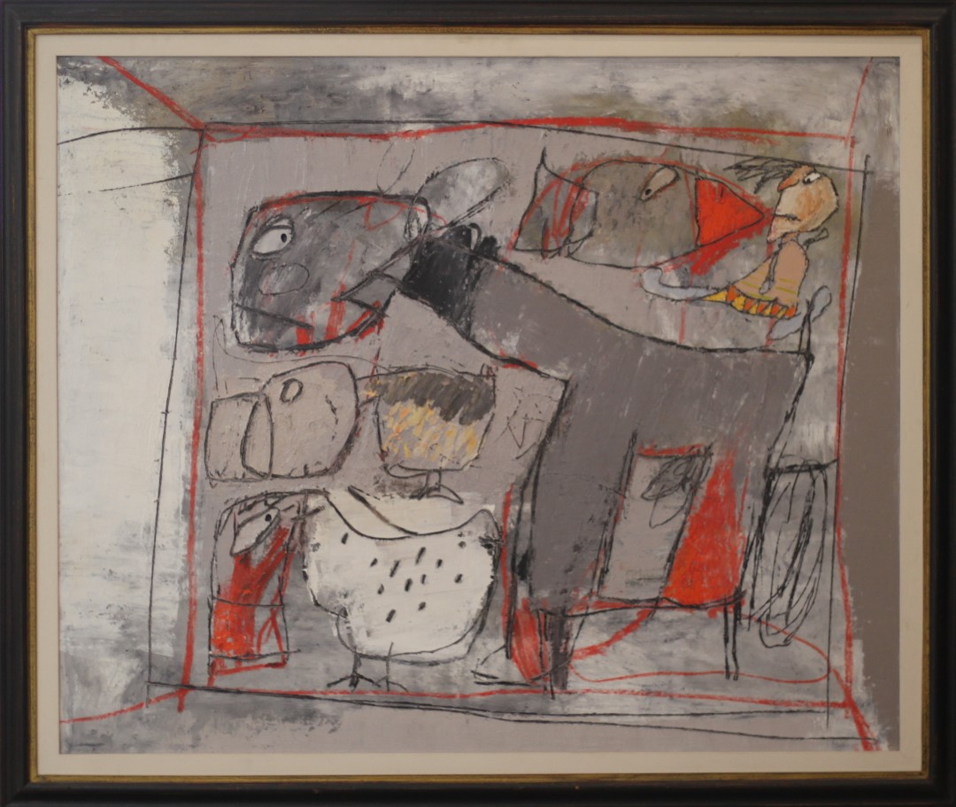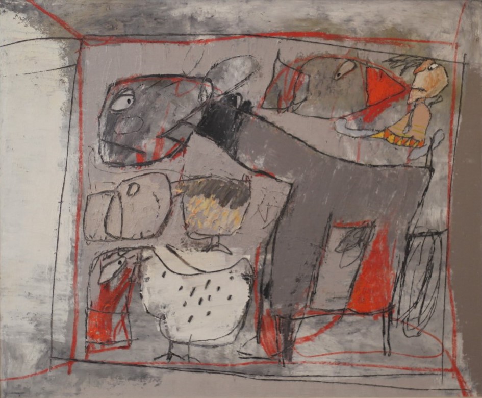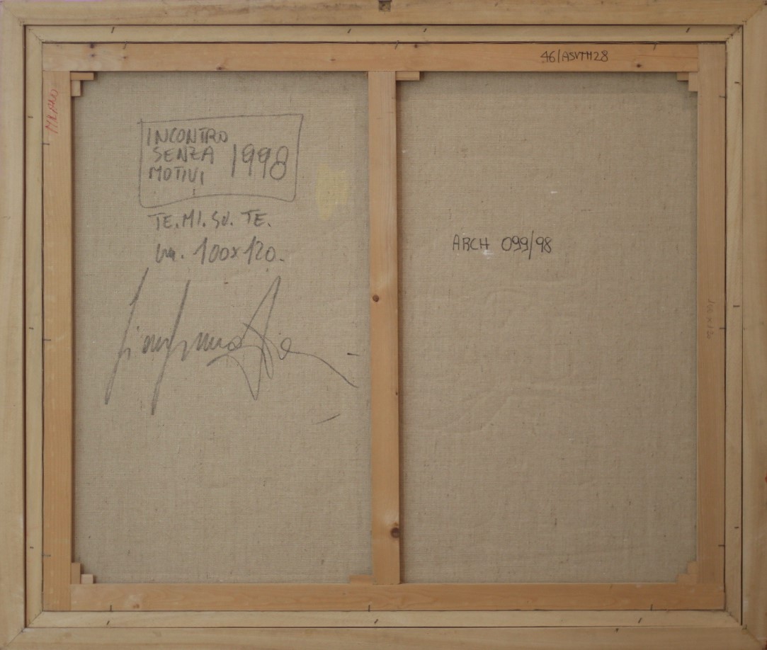 Gianfranco Asveri (Fiorenzuola d'Arda 1948) Incontro senza motivi 1998 Dim.100x120 Tecnica mista su tela Autentica su foto dell’artista Al verso titolo, data, firma e numero Archivio 099/98