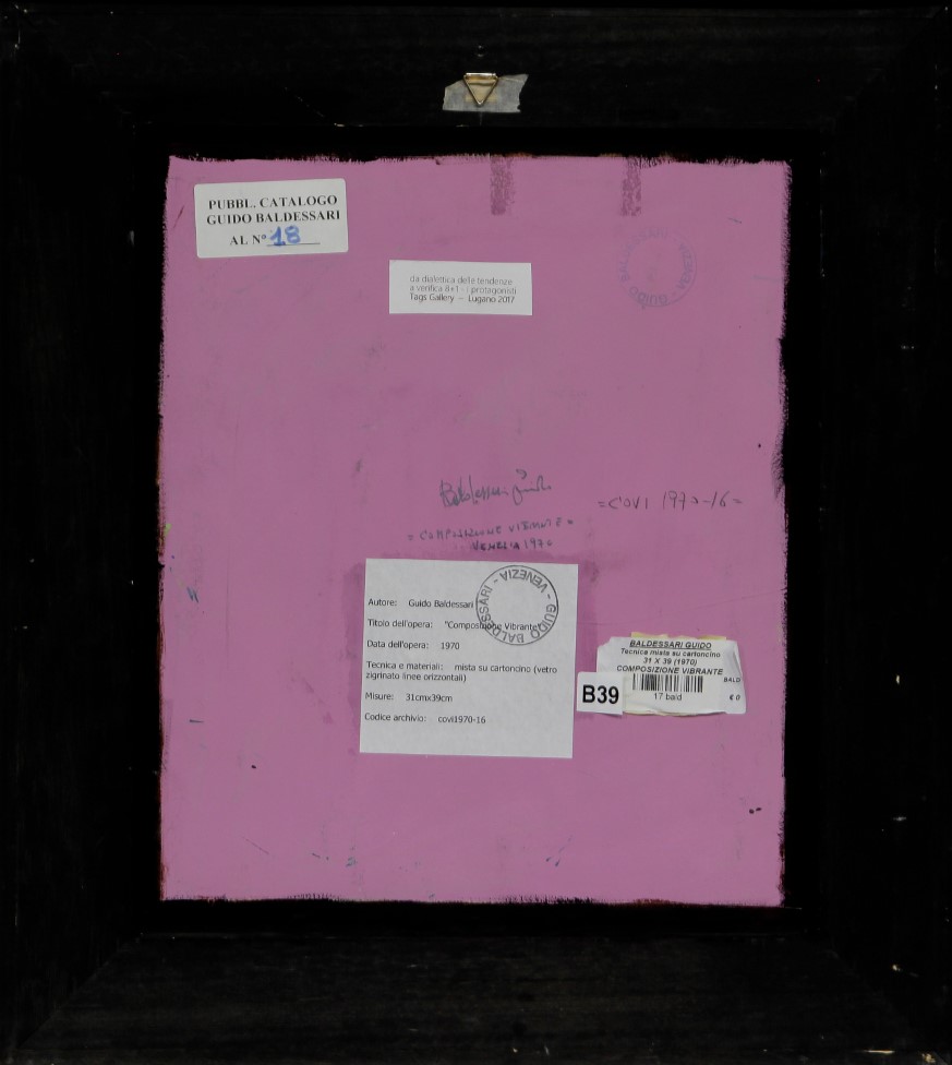 Guido Baldessari (Venezia 1938 - Venezia 2016) Composizione vibrante 1970 Dim.39x31 Tecnica mista su cartoncino e plexiglass zigrinato Opera pubblicata sul Catalogo delle Opere di Guido Baldessari Codice Archivio Covi 1970-16 Al verso firma, titolo e data