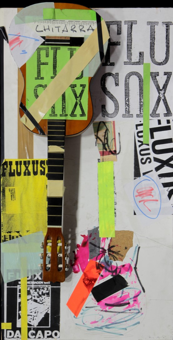 Giuseppe Chiari (Firenze 1926 - Firenze 2007) Chitarra Anni 90 Dim.105,6,x55 Chitarra e tecnica mista su tavola Autentica su foto dell’artista Titolo in alto al centro Firmato in basso a dx