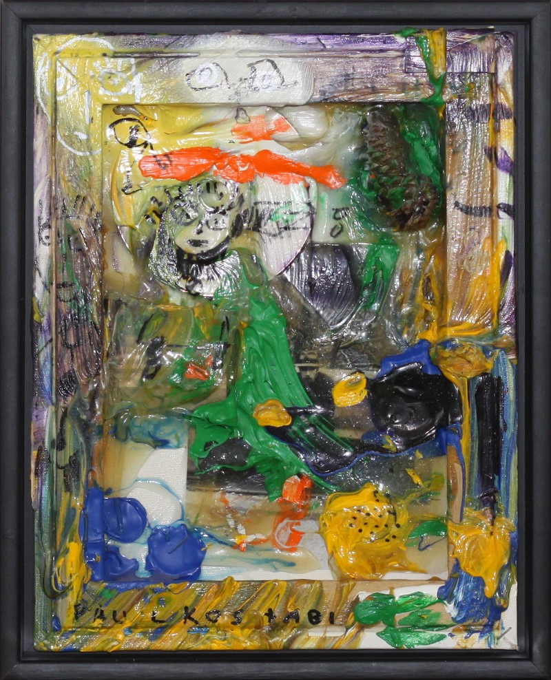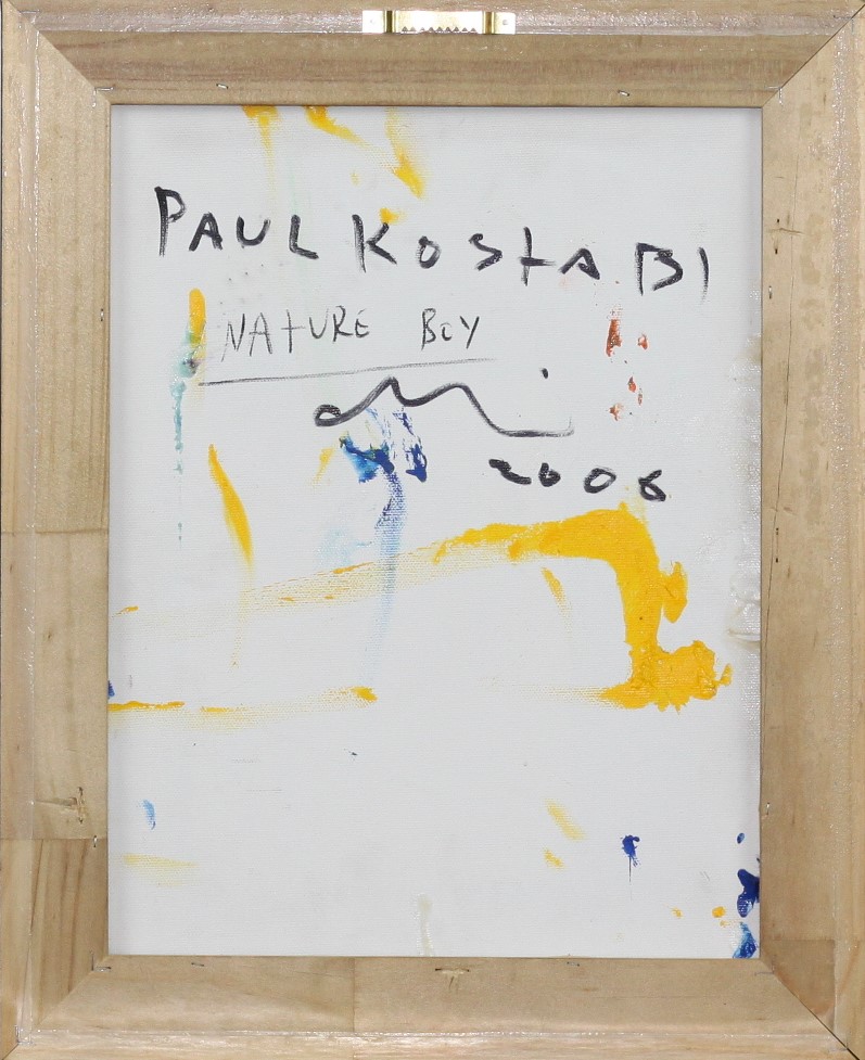 Paul Kostabi (Whittier 1962) Nature boy 2006 Dim.35x28 Acrilico, marker, collage ed oggetti su retro tela Provenienza Pancaldi Arte Contemporanea Roma Certificato di autenticità di Paul Kostabi Al verso firma, titolo e data Firmato in basso a sx