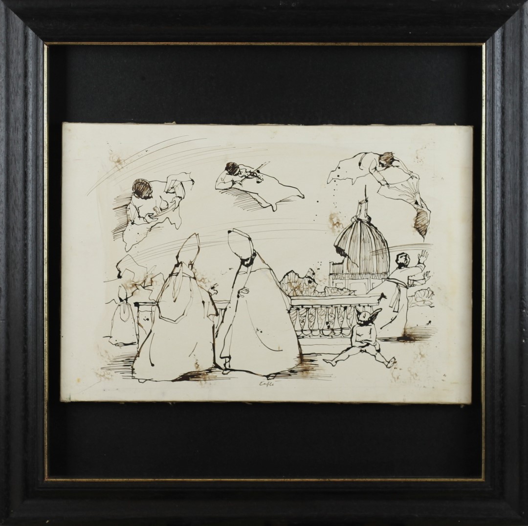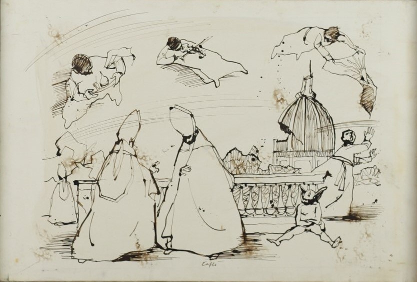 Nino Caffè (Alfedena 1908 - Pesaro 1975) Senza Titolo Dim.34x50 China e acquerello su carta intelata Al verso timbro Edizione d’Arte La Lastra Treviso e Firma M.L. Galanti Firmato in basso al centro