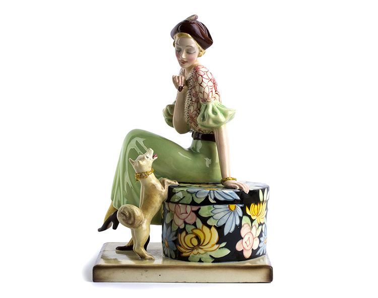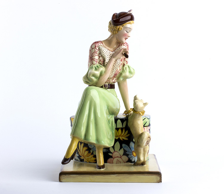 Nove, 1890 - 1975 Damina con cane, Anni ‘30 Scultura in ceramica dipinta, h. 28 cm Firma in basso al retro: DORO