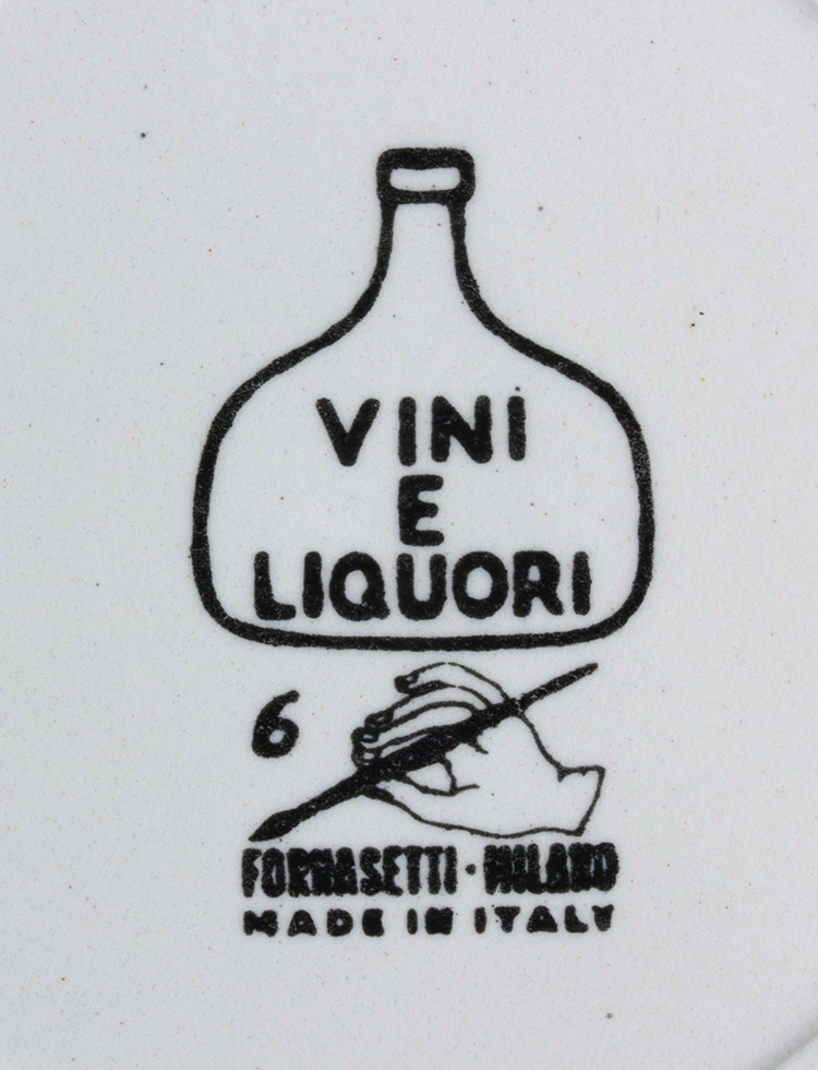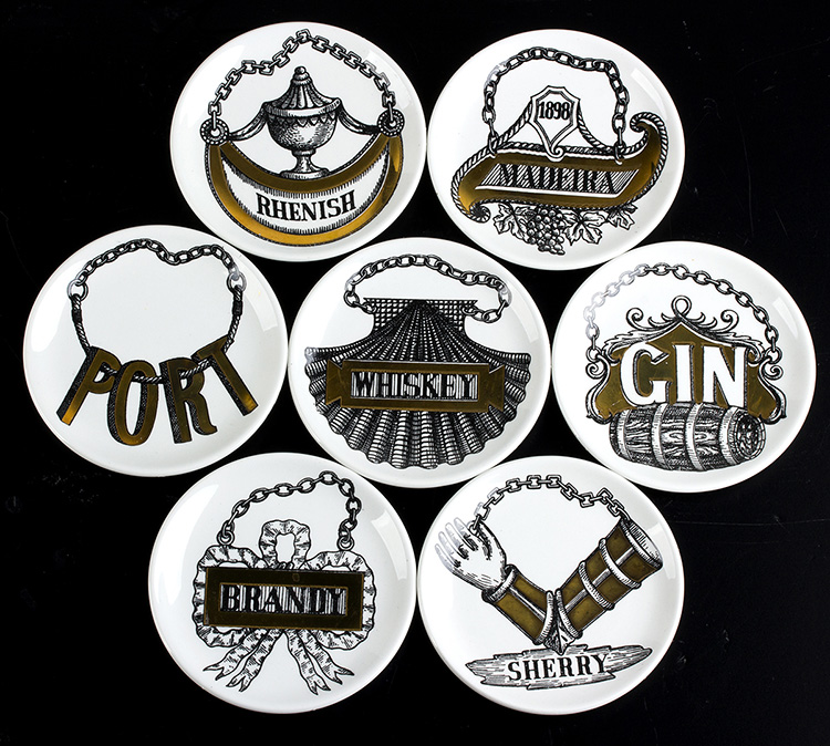 FORNASETTI - MILANO Sette piattini da liquore Ceramica bianca e dorata, d. 10 cm Inscritti sotto la base: Vini e liquori FORNASETTI - MILANO, MADE IN ITALY CONDITION REPORT Lievi difetti
