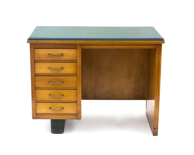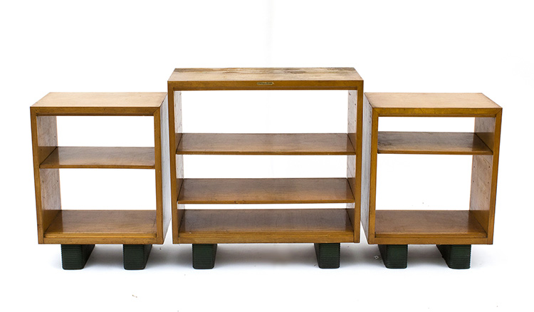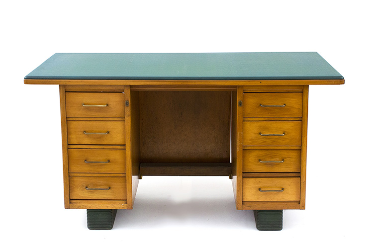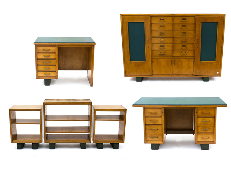 ANTONIO FERRETTI - MILANO Set di mobili da ufficio composto da uno schedario, due scrivanie e tre piccole librerie a giorno, Anni ‘30/’40 Legno di faggio e rivestimenti in pelle, misure varie Sul retro di ogni mobile l’etichetta della ditta: Antonio Ferretti - Milano Per esemplari simili si veda il catalogo della ditta Antonio Ferretti, 1948