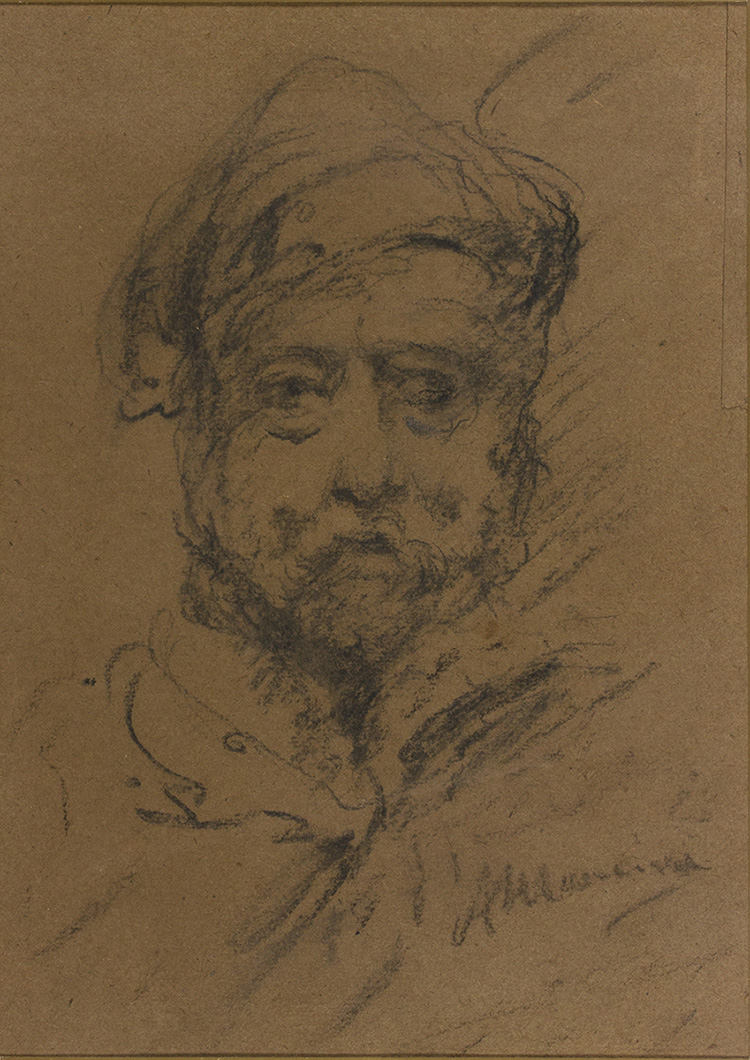 Roma, 1852 - 1930 Autoritratto con cappello Carboncino su carta marroncina, 19,5 x 14 cm circa Firma in basso a destra: A. Mancini