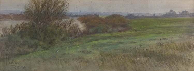 Roma, 1874 - 1959 Paesaggio lungo il fiume Pastelli su carta, 24 x 64 cm circa Firma e luogo in basso a sinistra: P. Fabri Roma