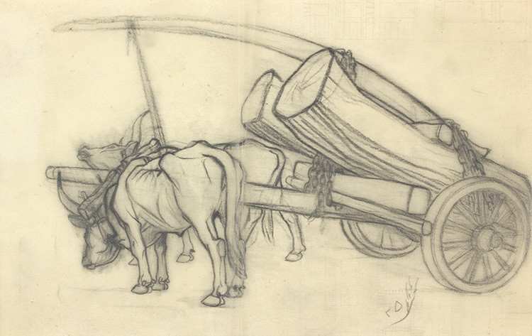 Roma, 1876 - 1960 Carro per il trasporto di legname Carboncino su carta marroncina, 17 x 27 cm circa Firma in basso a destra: CD