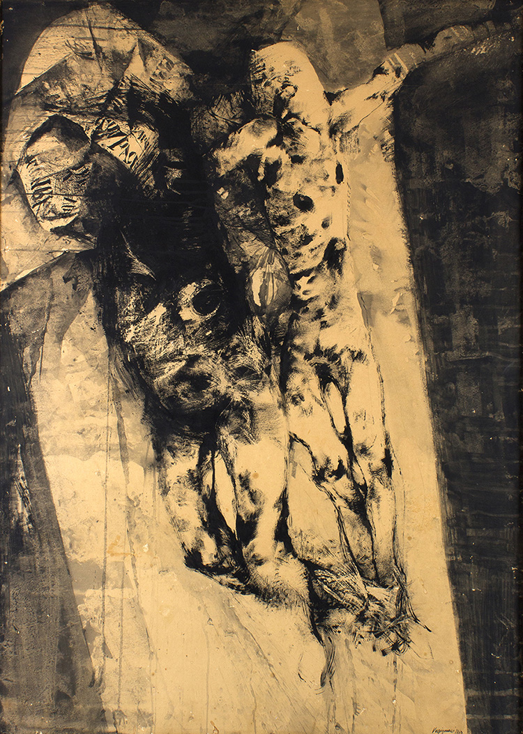 Crocifissione, 1963 Olio, acquarello, inchiostri e matita su carta applicata su tela, 140 x 100 cm Firma e data in basso a destra: Vespignani 1963