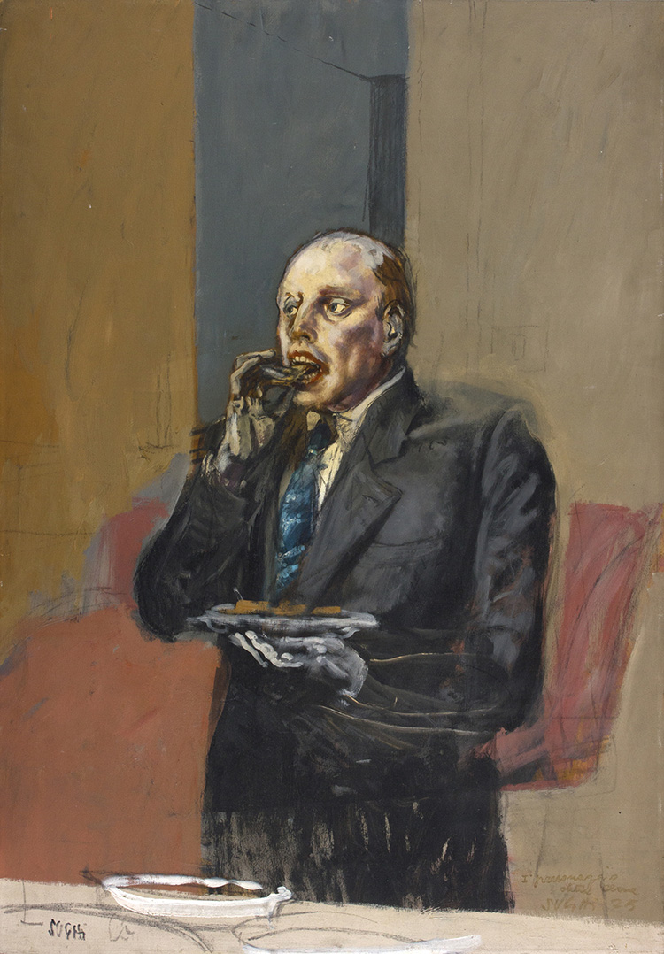 Firma, data e iscrizione in basso a destra: I° personaggio della cena, Sughi 75