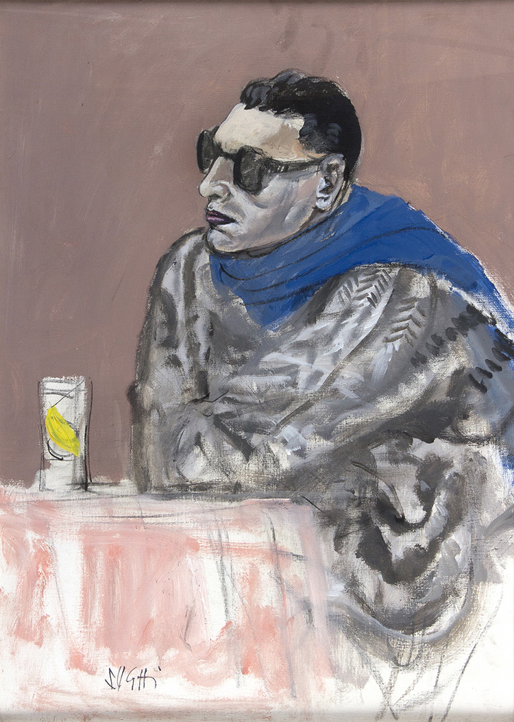 Cesena, 1928 - Bologna, 2012 Al tavolo da Canova Olio su tela, 70 x 50 cm Firma in basso a sinistra: Sughi