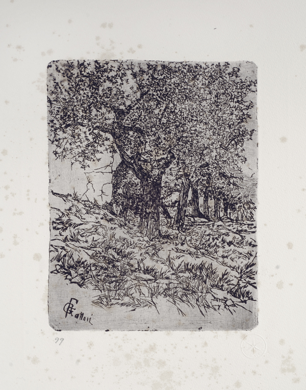 Giovanni Fattori (Livorno, 1825 - Firenze, 1908) Alberi Acquaforte, mm.505x350 (foglio); mm.214x165 (lastra) Firma in lastra in basso a sinistra; timbro a secco del cinquantenario in basso a destra. € 200/300