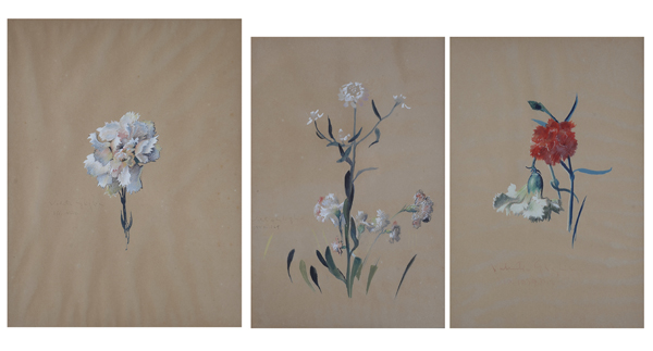 Valentino Ghiglia (Firenze, 1903 - 1960) Fiori Lotto composto da tre opere: A) Garofani bianchi Tecnica mista su carta cm. 54x41 Firma a destra nella composizione. Sul verso: dedica a firma Mario Galli B) Garofani bianchi e rossi, 1939, Tempera su carta, cm. 49x34,5, Firma e data in basso al centro. C) Garofani, 1940, Tempera su carta, cm. 49x33,5, Firma e data in basso a sinistra. € 450/650