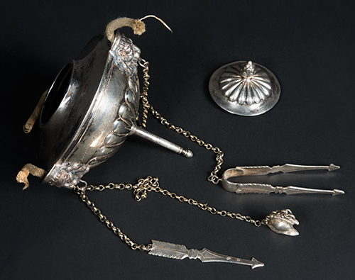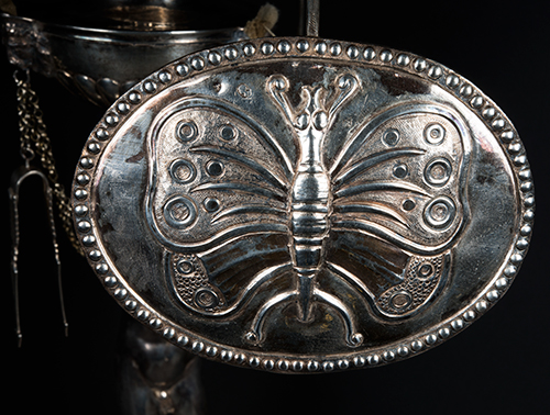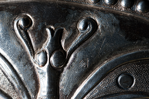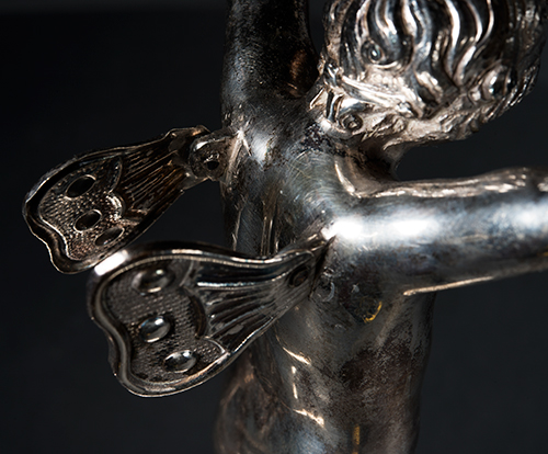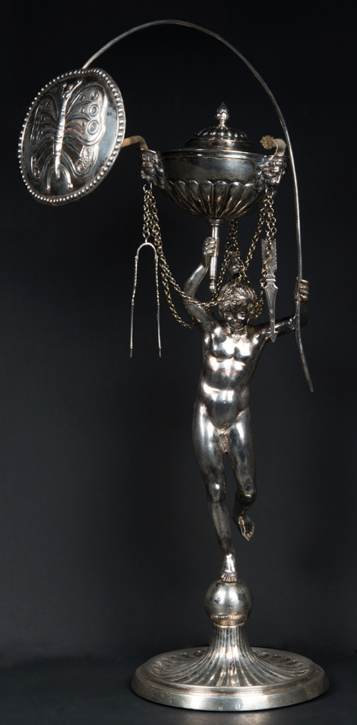 Filippo Pacetti (attivo tra il 1809 e il 1857) Lampada da biblioteca con efebo alato, 1815 Argento 800 42x32x14,2 cm; 1215 g (in parte, riempitivo della base) Lampada da biblioteca in argento, prodotta dall'argentiere Filippo Pacetti in Roma, nel 1815, e completa di ogni parte