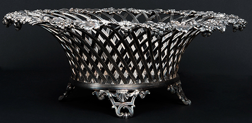 Devecchi, Milano, 1920-1930 circa Cestino portapane Argento 925 10,5x30,5x26 cm; 1160 g Cestino in argento con bordo lavorato a raffigurare un tralcio d’uva