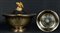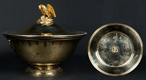 Argentiere russo e saggiatore Alexander Ilitsch Jaschinow (1795-1826), San Pietroburgo, 1800; Tiffany & Co, 1940 ca. Zuppiera e piatto Zuppiera: argento 875 dorato. Piatto: Vermeil con placcatura in oro 18 k. Base: legno e velluto Zuppiera: 19,5x24x24 cm; 1675 g Piatto: 1,4x23,5 cm; 580 g Base: 5x30,5,4x30,4 cm Piccola zuppiera di fine argenteria russa dell'ultimo anno di regno di Paolo I, saggiata da Alexander Ilitsch Jaschinow in San Pietroburgo, con bordo lavorato ed inciso, coperchio con presa a forma di aquila, un attacco per manico mobile (mancante). Piatto incongruo Tiffany placcato oro. Base per esposizione