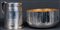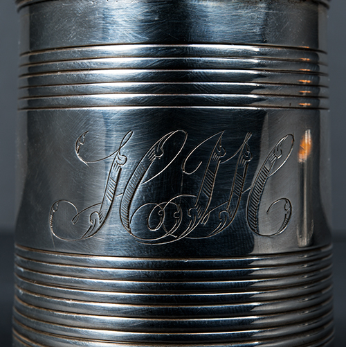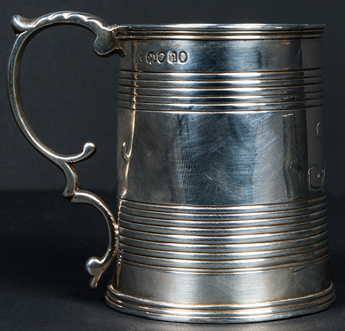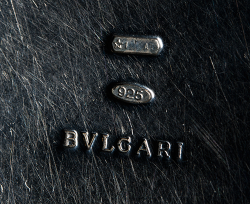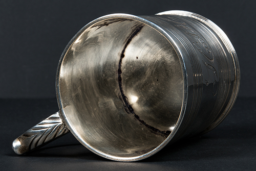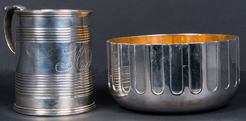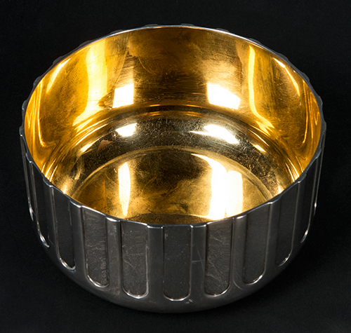 Joseph I & Joseph II Angell (metà del XIX secolo); Bulgari Boccale nuziale, 1835; coppetta, 1968-1970 Argento 925, con dorature Boccale nuziale: 8x9x6,4 cm; 130 g Coppetta: 5,3x10,3 cm; 410 g Il boccale nuziale consente di anticipare al 1835 la attività di Joseph I & Joseph II Angell, registrati all'ufficio di saggio di Londra dal 1840, e reca anche il duty mark introdotto dalla corona per la tassazione. La coppetta in argento con interno dorato, bordo ornato di costolature, è stata disegnata da Bulgari e realizzata da Gori & Zucchi, argentieri in Arezzo, tra il 1968 (anni di introduzione della losanga incisa sul bene) e il 1970. Dal 1971, infatti, l'azienda aretina cambia nome in UNO A ERRE ITALIA SPA