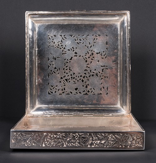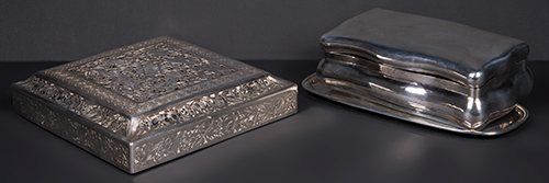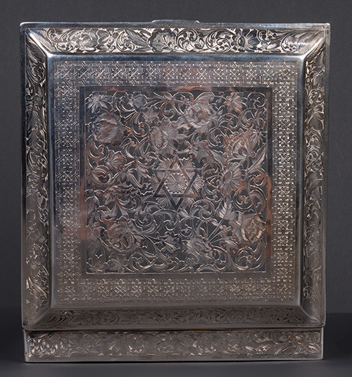 Medio Oriente; Mario Buccellati (1949-), Milano; Bruno Zanovello, Padova (1962-1971) Scatola con stella di David, II metà del XX secolo; scatola in stile Barocchetto, post 1968; vassoio portalettere, 1962-1971 Argenti di vario titolo Scatola con stella di David: 4,4x18,6x18,6 cm; 750 g Scatola in stile Barocchetto: 6,5x19,3x11 cm; 440 g Vassoio portalettere: 1x21,8x10,6 cm; 140 g