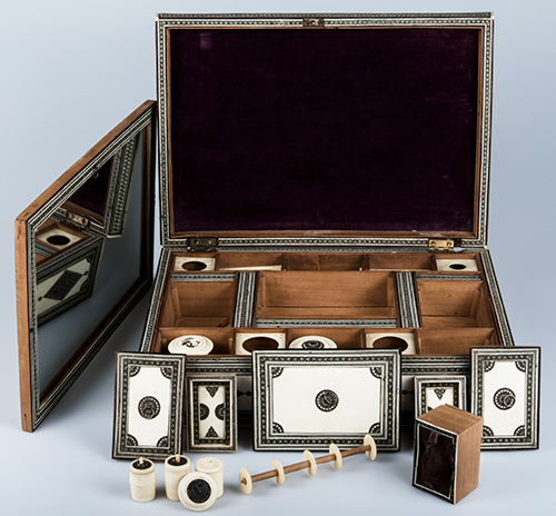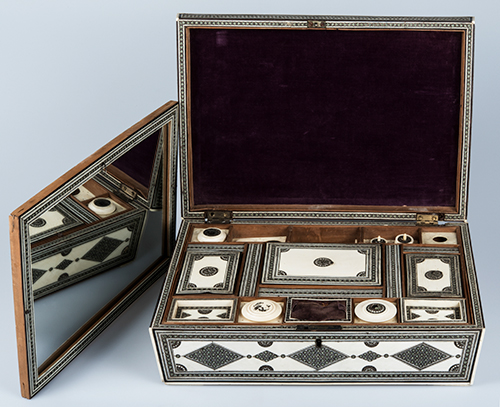 India occidentale, Mumbai Scatola per sartoria rivestita d'avorio e decorata in mosaico sadeli, XIX secolo Legno di sandalo, avorio, metallo, specchio 11,6x33,1x23,4 cm Intarsiata in avorio e decorata con micromosaici di altri materiali e presenta una ricca struttura di scomparti interni e specchio estraibile. Su base fotografica, la dr.ssa Laura Giuliano, funzionario del Museo Nazionale d'Arte Orientale di Roma, ha identificato il particolare "mosaico sadeli, una tecnica persiana che attraverso il Sind giunse nell’area di Mumbai prima del XVIII secolo". Collocata e datata la produzione del lotto nella Mumbai del XIX secolo, la specialista precisa che "simili manufatti, caratterizzati dallo stesso genere di decorazione, erano realizzati per la clientela britannica residente in India o venivano prodotti per il mercato europeo".