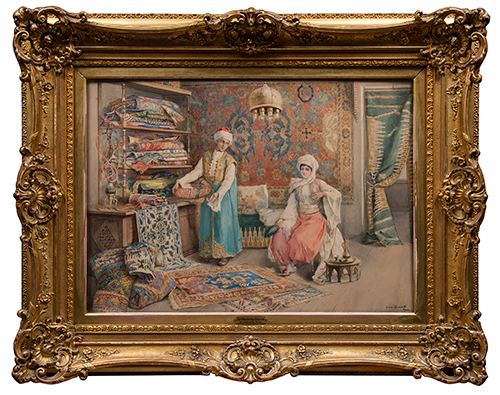 Amedeo Simonetti (1874-1922) Il mercante di tappeti Acquarello su carta applicata su cartoncino 54,4x75,9 cm Il lotto arredava l'ingresso signorile di Casa Rizzoli