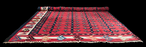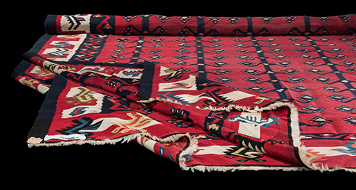 Produzione di gusto europeo Tappeto tipo Kilim, 1960 circa Lana e altri tessuti 380x344 cm Il tappeto non presenta lo spessore tipico del Kilim di produzione tradizionale e va dunque considerato un tappeto a ordito leggero, il che facilitava lo spostamento relegandolo a mero strumento di arredo. Probabilmente prodotto negli anni Sessanta, trae il suo interesse principale dal fatto di aver arredato il salone dei ricevimenti della famiglia Rizzoli, portando la testimonianza di grandi incontri come i personaggi più in vista del cinema e della poltica italiani, da Paolo Villaggio a Silvio Berlusconi. Il tappeto compare in immagine piegato a metà e parzialmente srotolato.