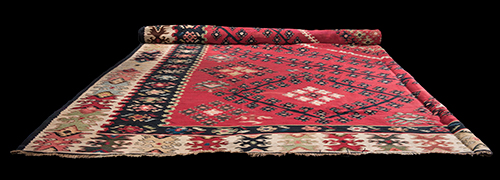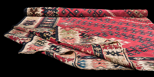 Produzione di gusto europeo Tappeto tipo Kilim, 1960 circa Lana e altri tessuti 404x340 cm Il tappeto non presenta lo spessore tipico del Kilim di produzione tradizionale e va dunque considerato un tappeto a ordito leggero, il che facilitava lo spostamento relegandolo a mero strumento di arredo. Probabilmente prodotto negli anni Sessanta, trae il suo interesse principale dal fatto di aver arredato il salone dei ricevimenti della famiglia Rizzoli, portando la testimonianza di grandi incontri come i personaggi più in vista del cinema e della poltica italiani, da Paolo Villaggio a Silvio Berlusconi. Il tappeto compare in immagine piegato a metà e parzialmente srotolato.