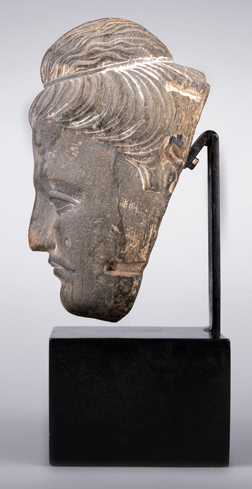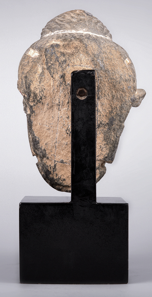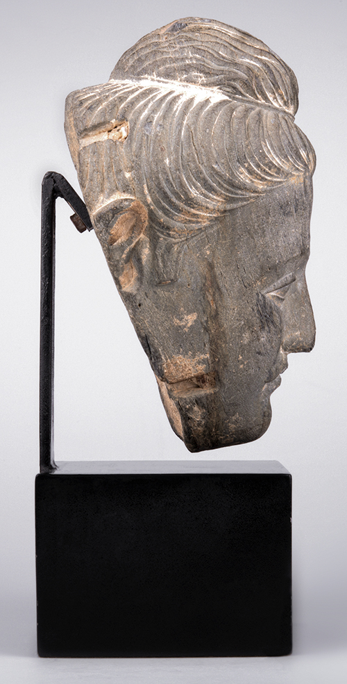 Pakistan, Arte del Gandhara, II-III secolo d. C. Testa di Buddha Maytreya Scisto, metallo Statua: 23,8x15,5x11,5 cm Base: 9,3x13x13 cm Ringraziamo il Prof. Sergio Romagnoli, che, esaminato l'oggetto dal vero, ne ha confermato la autenticità e la datazione. Su base fotografica, la dr.ssa Laura Giuliano, funzionario del Museo Nazionale d'Arte Orientale di Roma, conferma la autenticità e la datazione e così descrive il volto: "Testa del Buddha con baffi e ushnisha (protuberanza cranica) coperto di capelli acconciati a mo’ di chignon, stretto alla base da una sottile fascetta"