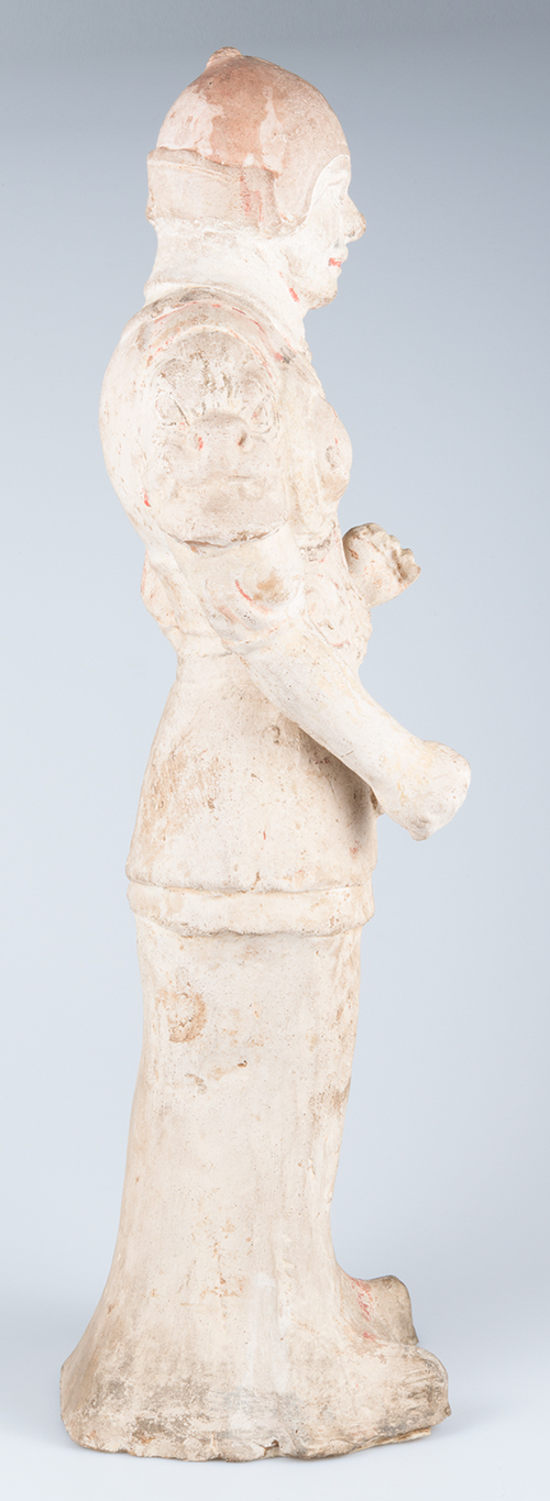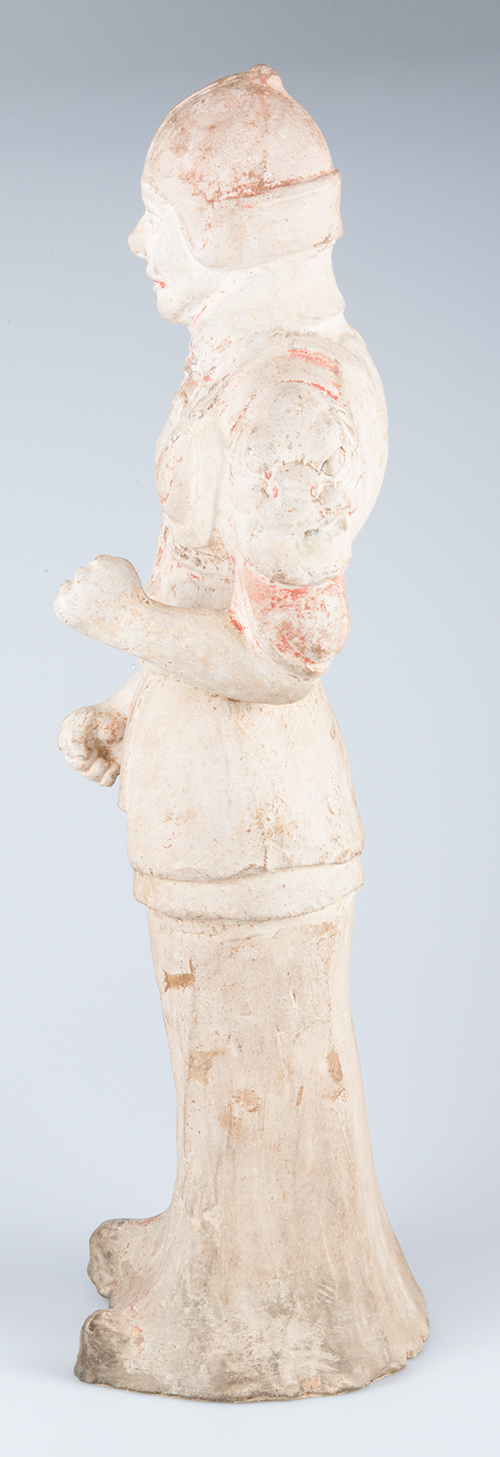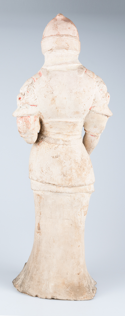 Cina. Dinastia Sui (581-618) o inizio dinastia Tang (618-907), sec. VII Lanciere o portatore di stendardo Terracotta caolinitica con tracce di pigmenti policromi stesi a freddo 58,5x18x16,5 cm Ringraziamo il Prof. Sergio Romagnoli, che, esaminato l'oggetto dal vero, ne ha confermato la datazione all'epoca Tang (618-907 d.C.), e precisamente all'VIII secolo. A seguito di un esame su base fotografica, il Dr. Roberto Ciarla, del Museo Nazionale d'Arte Orientale, Roma, ha identificato la statua come un lanciere o partatore di stendardo, con funzione di corredo funerario, anticipando la datazione al VII secolo, nel passaggio tra la Dinastia Sui (581-618) e l'inizio della dinastia Tang (618-907). Il lotto arredava il salone dei ricevimenti di Casa Rizzoli