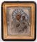 Decoratore, XX secolo, e argentiere non identificato, fine del XIX secolo Madre di Dio di Smolensk Riproduzione ripresa a mano, argento con lavorazione guilloché, smalti cloisonné 27x22,5 cm L'immagine è una riproduzione a stampa applicata su legno. L'icona è conservata entro teca in legno. Nota bene, nell'immagine fotografica la decorazione smaltata appare intera, ma la parte terminale dell'aureola del Bambin Gesù è spezzata ed è semplicemente appoggiata in adesione e continuità con la restante parte .