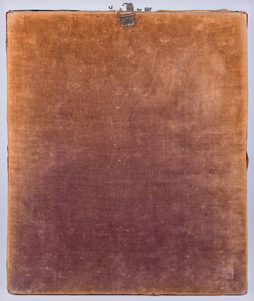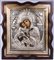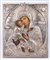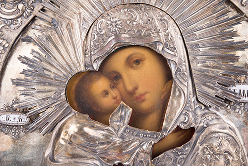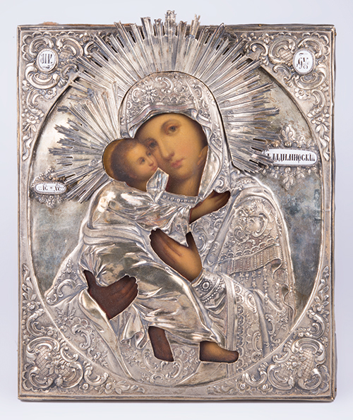 Iconografo e argentiere russi, inizi del XIX secolo, e saggiatore Andreij Antonovich Kovalskij (1821-1856) (?) Madre di Dio di Vladimir Tempera all'uovo, olio, oro su tavola, argento e inserti in ceramica dipinta 32,5x26,5x4,5 cm La datazione al quarto decennio del XIX secolo si riferisce all'anno di produzione della riza, saggiata con tutta probabilità - il marchio non è perfettamente leggibile - da Andreij Antonovich Kovalskij (1821-1856). L'icona è precedente ed è stata a lungo oggetto di venerazione come testimoniano gli effetti del calore delle candele di cera e incenso sulla superficie, di cui si sente ancora il profumo. Cornice dorata entro teca in legno e vetro