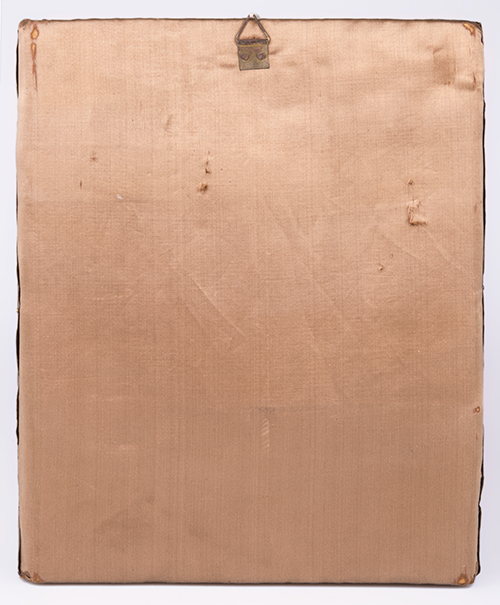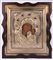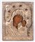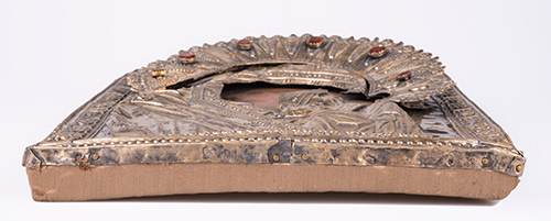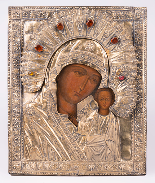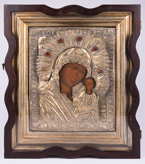 Iconografo russo, argentiere di Velikij Ustjug (?), e saggiatore non identificato Madre di Dio di Kazan, inizi del XIX secolo e 1827 Tempera all'uovo, olio, oro su tavola, argento dorato e pietre colorate incastonate 30,7x25x5 cm La datazione al 1827 si riferisce all'anno di produzione della riza, probabilmente nella cittadina di Velikij Ustjug, Oblast' di Vologda, nella Russia europea. L'icona è precedente ed è stata a lungo oggetto di venerazione come testimoniano gli effetti del calore delle candele di cera e incenso sulla superficie (in particolare la parte bassa, pressoché del tutto perduta), di cui si sente ancora il profumo. La riza attuale sostituisce, con tutta probabilità, una riza precedente, con morso più stretto e di forma più semplice, la cui impronta - trasferitasi anche a causa del calore - è ben visibile sulla tavola. Cornice dorata entro teca in legno e vetro.