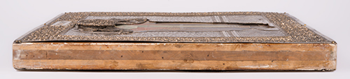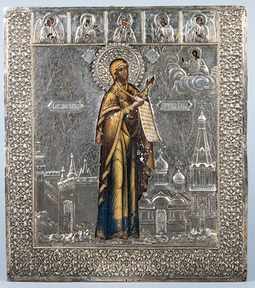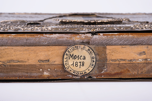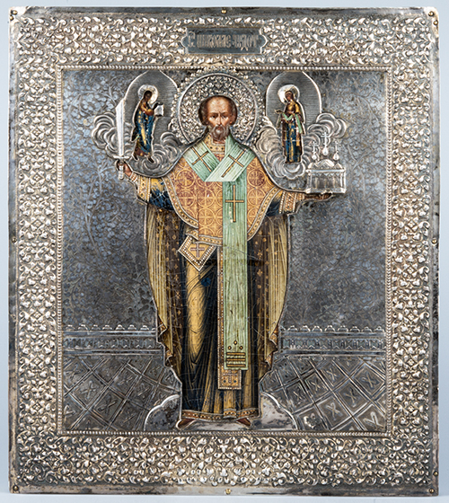 Iconografo e argentiere russi, XIX secolo, e saggiatore Viktor Vasilievich Savinsky (attività 1859-1894) o Vladimir Stepanovich Smirnov (attività, 1878) La Vergine e S. Nicola. Icone biverso Tempera all'uovo, olio e foglia d'oro su tavola gessata, argento 35,8x31,5x3,7 cm Le due icone, accoppiate, sono da riferirsi ad un argentiere con marchio АШ non identificato, mentre la personalità del saggiatore è da identicarsi sulla base del marchio "В-С 1878", che è variamente attribuito in bibliografia a Viktor Vasilievich Savinsky (attività 1859-1894) o Vladimir Stepanovich Smirnov (attività, 1878). Pare da escludersi, per la precisazione della data, Veniamin Vasilievich Savinsky (attrività nota: 1862-1875). In ogni caso si tratta di produzione moscovita, come rilevabile dal marchio del banco di saggio. Le due icone provengono dalla collezione Bulgari, come testimonia una etichetta che ne fa risalire la proprietà al fondatore della famosa maison di oreficeria, Sotirio (1857-1932). La montatura in un unico corpo ripercorre la struttura originaria dell'oggetto, come dimostra la continuità della pellicola pittorica fino ai margini su entrambi i lati. La tavola centrale, invece, pare inserita a fini di conservazione negli anni Trenta, quando fecero il loro ingresso in azienda Costantino e Giorgio, figli di Sotirio, il primo dei quali versato per lo studio e interessato al versante collezionistico dell’argento, cominciò a raccogliere pezzi antichi, giade intagliate, icone e oggetti d’arte più in generale, mettendo mano anche ai beni del padre, di recenti ereditati. Molto probabilmente la doppia faccia della icona in asta, così come la particolare struttura della riza (quasi piatta e smarginata), è dovuta alla originaria inclusione nelle portelle di un altare insieme ad altre icone di analoga dimensione e fattura.