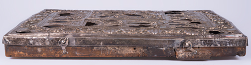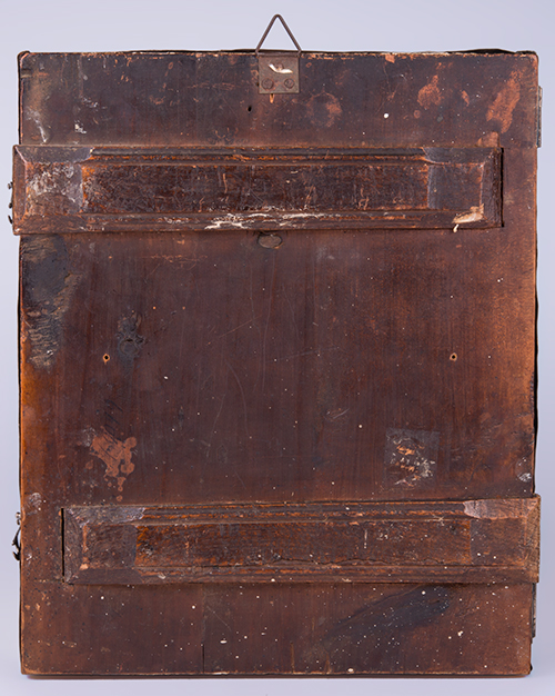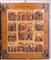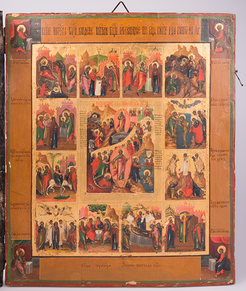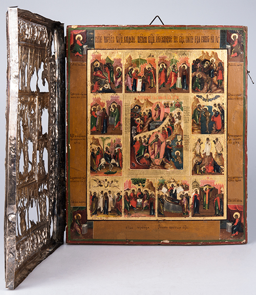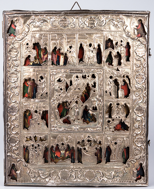 Iconografo russo, XVIII secolo, e saggiatore Andreij Antonovich Kovalskij (1821-1856) La Resurrezione di Cristo e le Dodici feste, XVIII secolo e 1848 Tempera all'uovo, olio e foglia d'oro su tavola gessata, argento 31,5x26,5x4 cm Con riza recante marchio di saggio di Andreij Antonovich Kovalskij (1821-1856), apposto a Mosca nel 1848. L'icona appare databile alla fine del XVIII secolo. La ricca iconografia presenta al centro la "Resurrezione del Cristo dal Sepolcro" e attorno dodici scene della vita di Cristo: la nascita della Vergine, la presentazione della Vergine, l'Annunciazione, la Natività, presentazione al tempio di Cristo, il Battesimo, l'entrata in Gerusalemme, la Trasfigurazione, l'Esaltazione della Croce , la dormizione della Vergine, la Pentecoste, l'Ascensione. La riza è stata modificata nella II metà del XX secolo per renderla apribile con la applicazione di cerniere e gancetti al fine di assicurarne la chiusura.