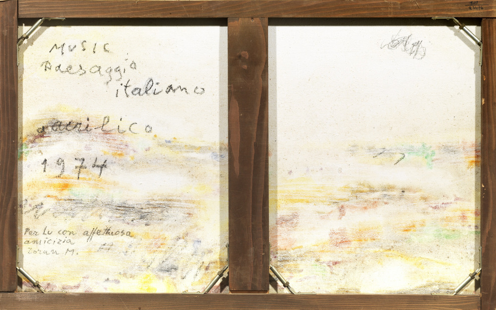 Zoran Music PAESAGGIO ITALIANO acrilico su tela, cm 60x92 firmato e datato sul retro: firmato, datato e dedicato ad personam eseguito nel 1974 Provenienza Collezione Igino Cerastico, Milano Collezione privata, Reggio Emilia L'opera proviene dall'importante raccolta dell'editore e collezionista Igino Cerastico, noto personaggio dell'ambiente imprenditoriale-finanziario milanese, nonché grande estimatore d'arte. Sul retro del dipinto troviamo infatti la dedica alla moglie di Cerastico, la signora Luisa Zecca (detta Lu). Cerastico aveva pubblicato, tra le sue edizioni di libri d'artista, Cadastre de cadavres di René de Solier illustrato con sette litografie originali di Music. È quindi estremamente probabile che l'opera sia entrata a far parte della sua collezione in seguito agli stretti rapporti intercorsi con Music.