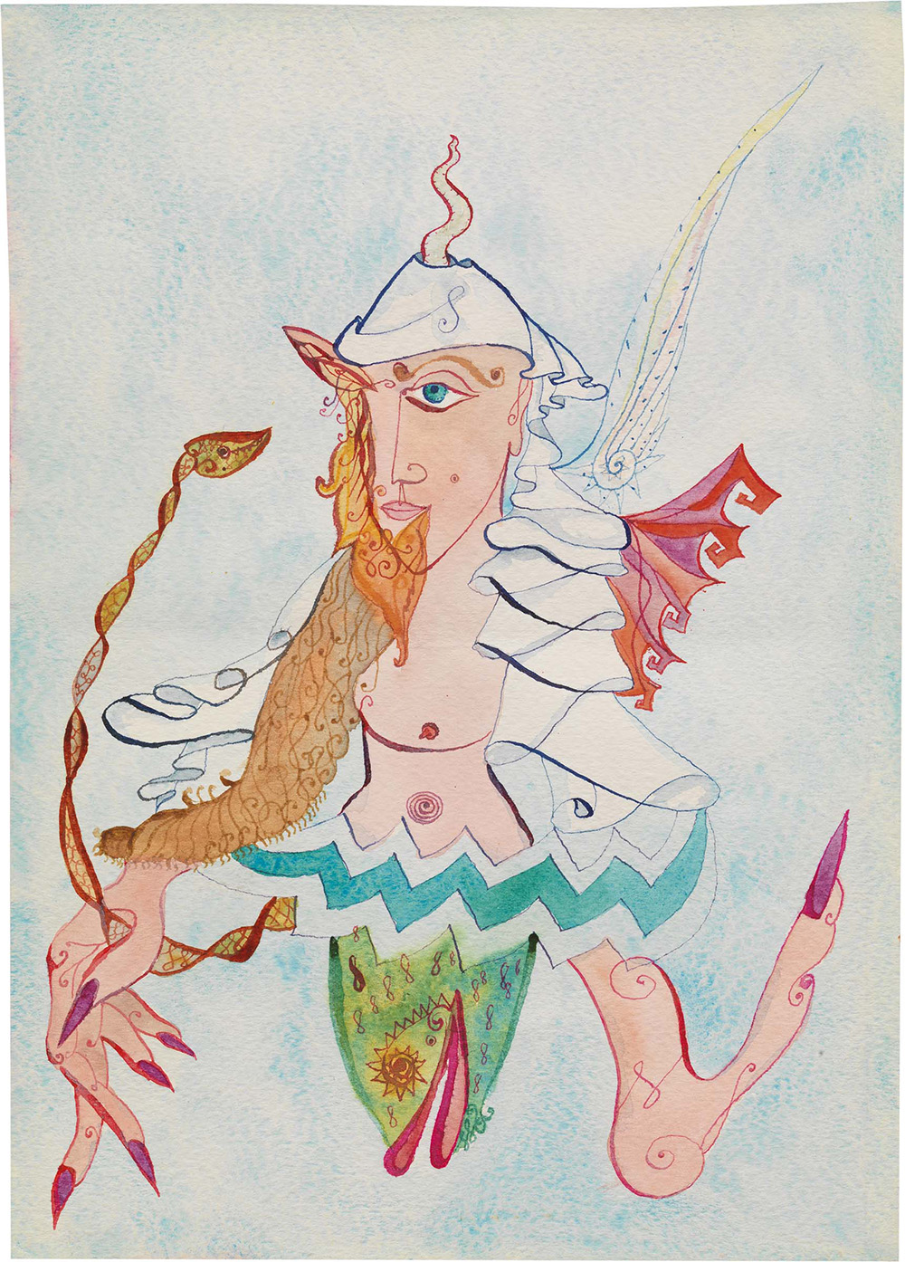 Luigi Ontani Vergato (Bo) 1943 Odin don dan, 1986 Acquerello su carta, cm. 33x24 Titolo, data, firma e luogo al verso: Odin / don / dan / 86 / Luigi Ontani / Roma A Tübingen.