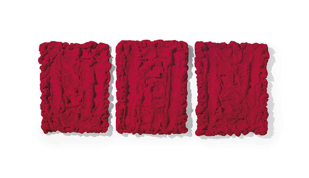 Pino Pinelli Catania 1938 Pittura R, 1997 Tecnica mista, tre elementi, cm. 27x64 ca. assieme Titolo, data e firma al verso di un elemento: "Pittura R" Milano / 1997 / Pino Pinelli. Foto autenticata dall'artista.